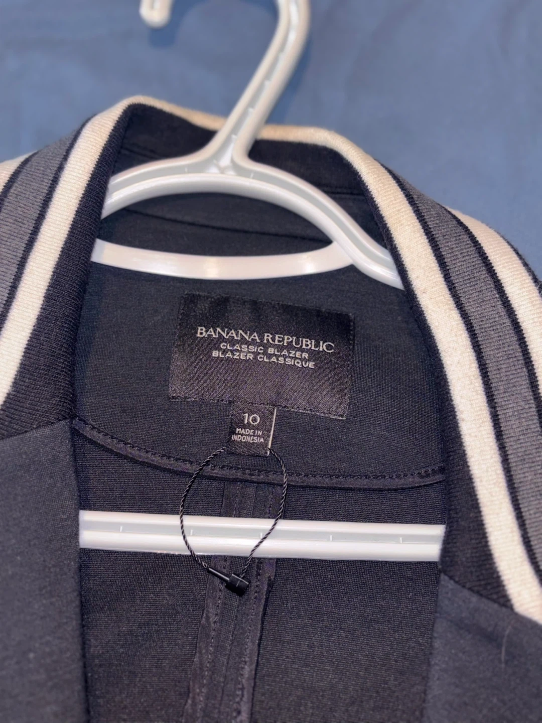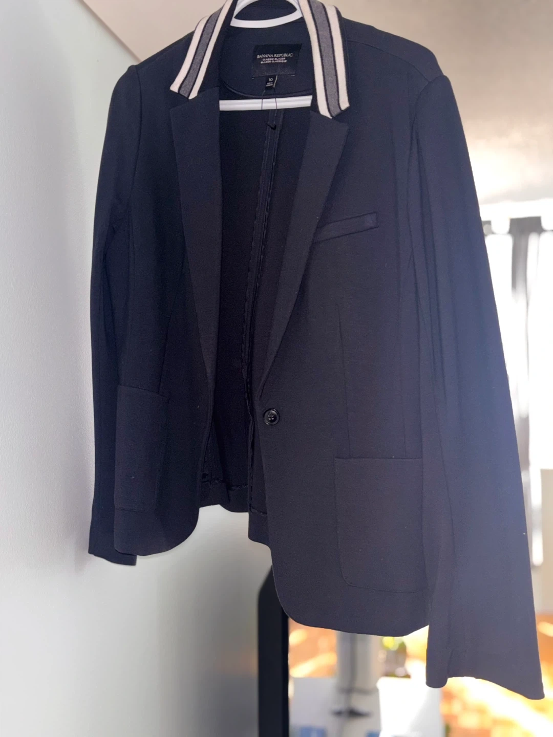 This is a Banana Republic black classic blazer. It's a size 10 with a striped collar detail. Single button closure and two front pockets.