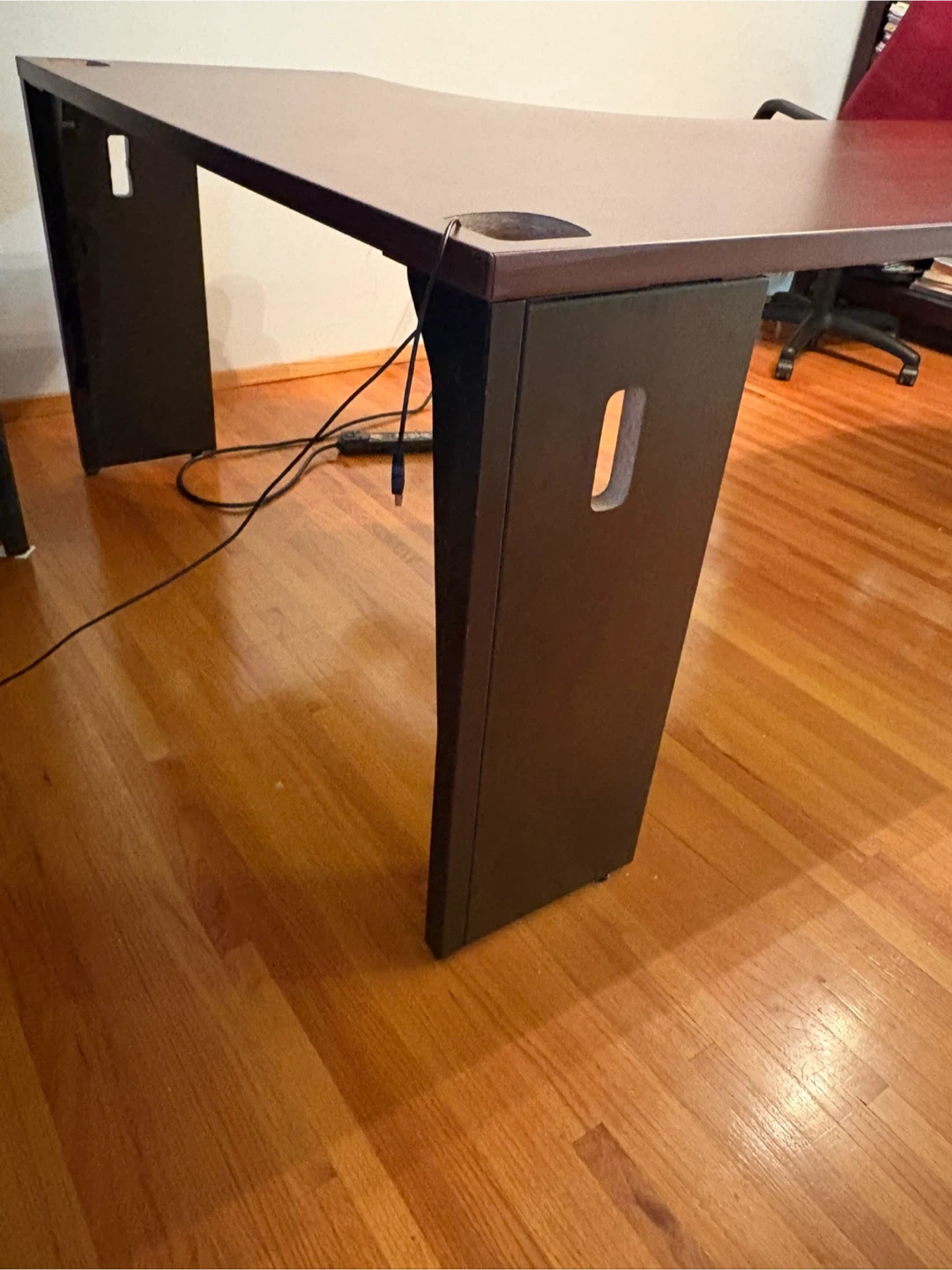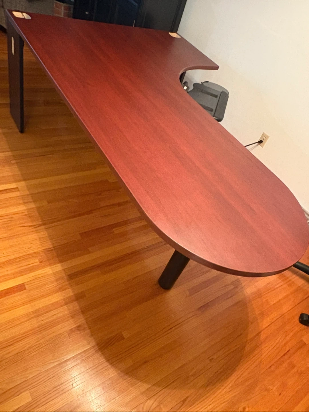 Spacious cherry-wood finish L-shaped desk. 84” L X 54” W x29” H It's designed for ergonomic comfort with a curved front edge. Includes a pull-out keyboard tray and a mouse platform. Plenty of surface area for multiple monitors and work essentials! Approx 7ft L by 4.6ft W