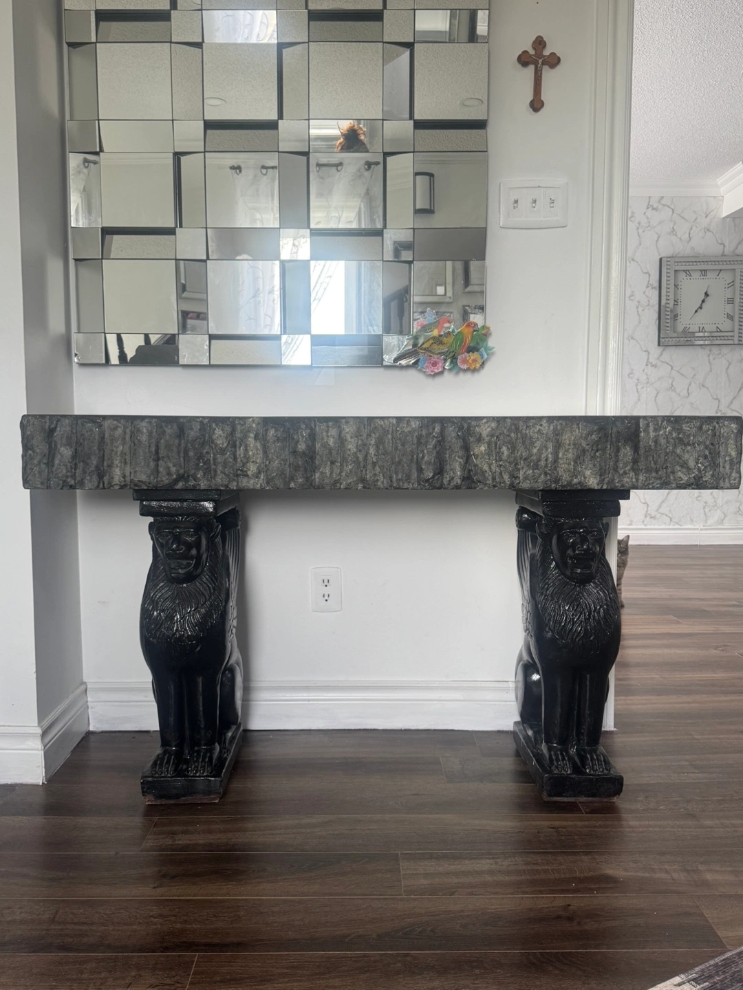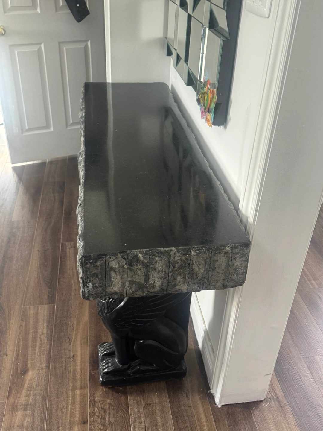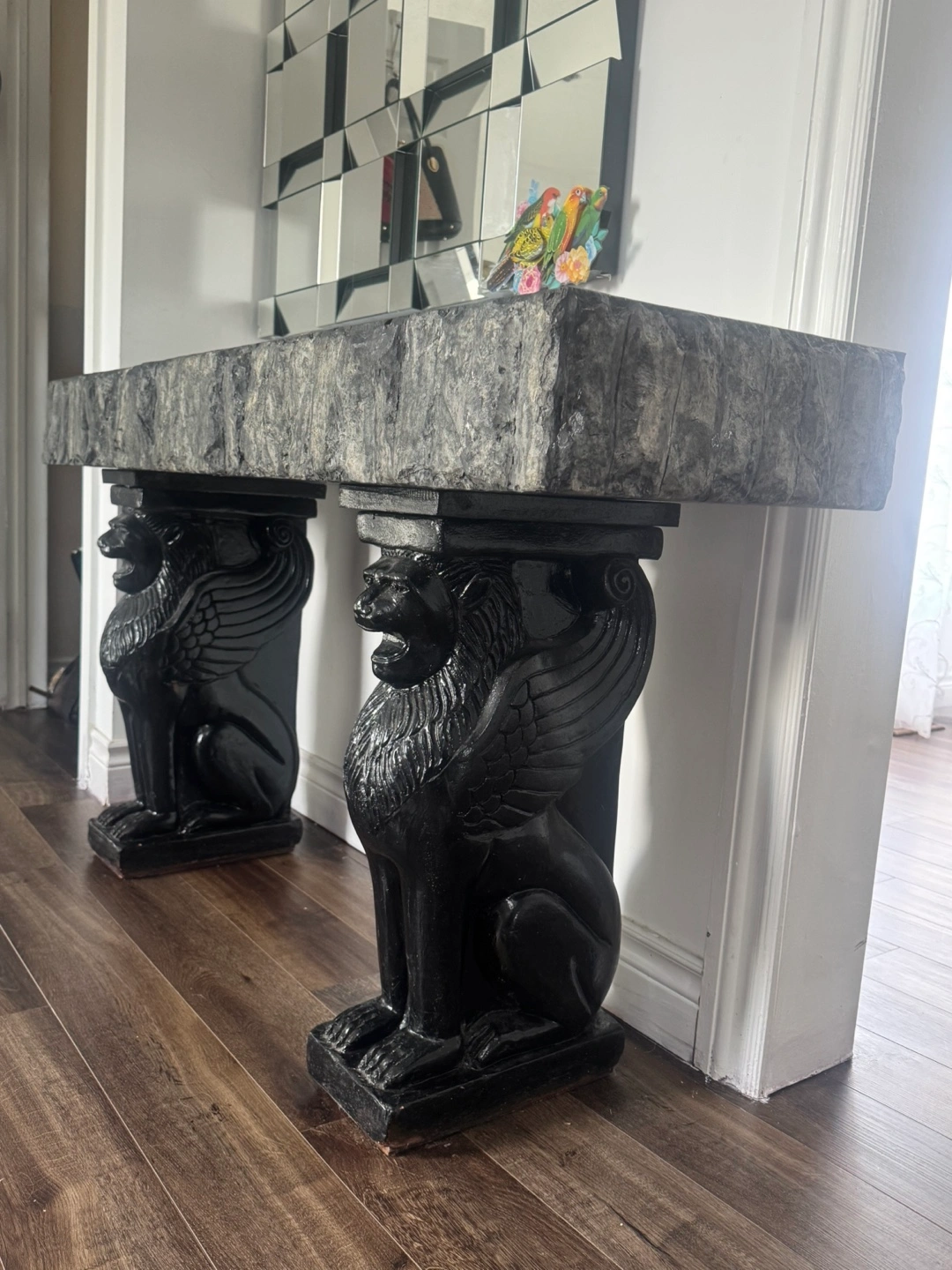 This is a really unique granite console table with a black finish and a cool lion base! It would make a great addition to any entryway or living room