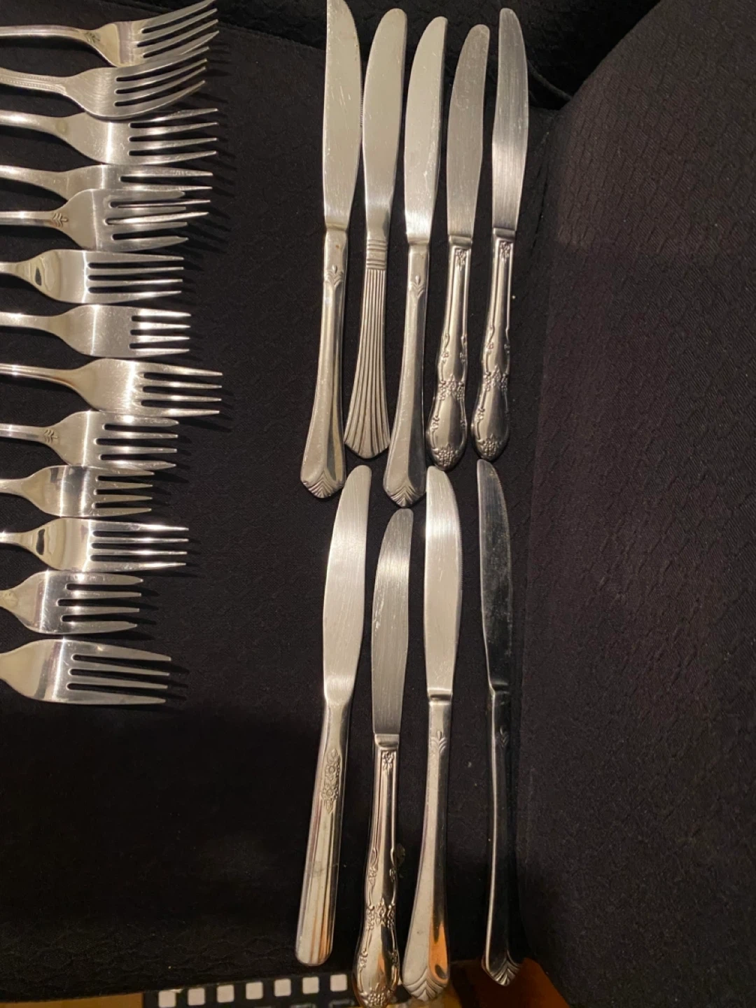 13 forks, 9 knives, and 10 spoons. The pieces feature a variety of decorative handle designs, showcasing different patterns and embellishments. Various sizes and patterns as shown in pictures.