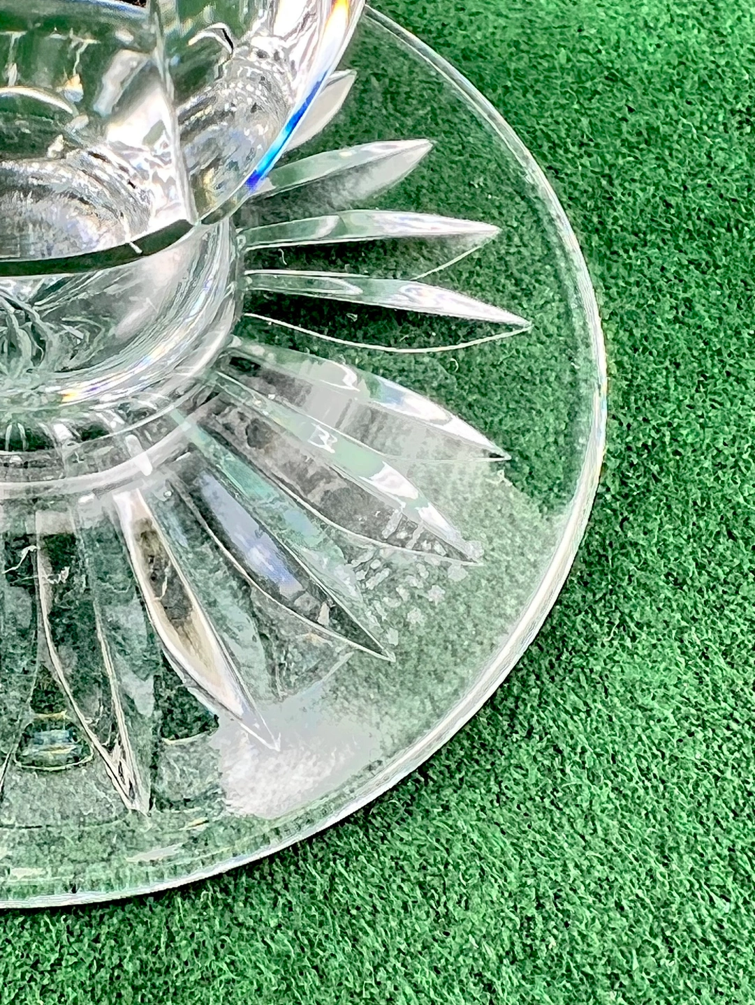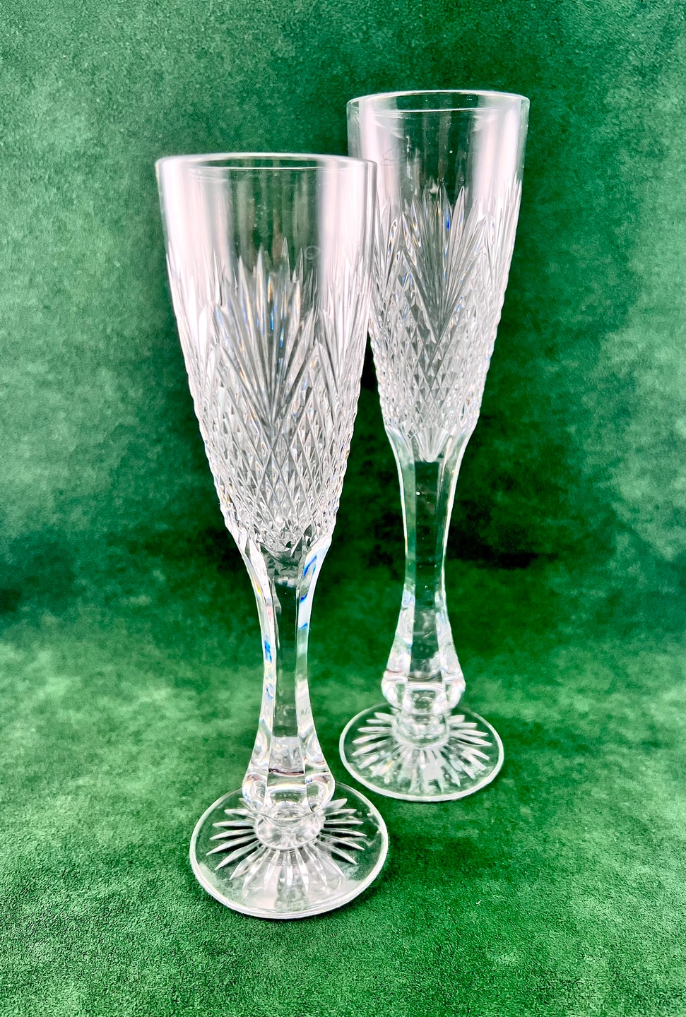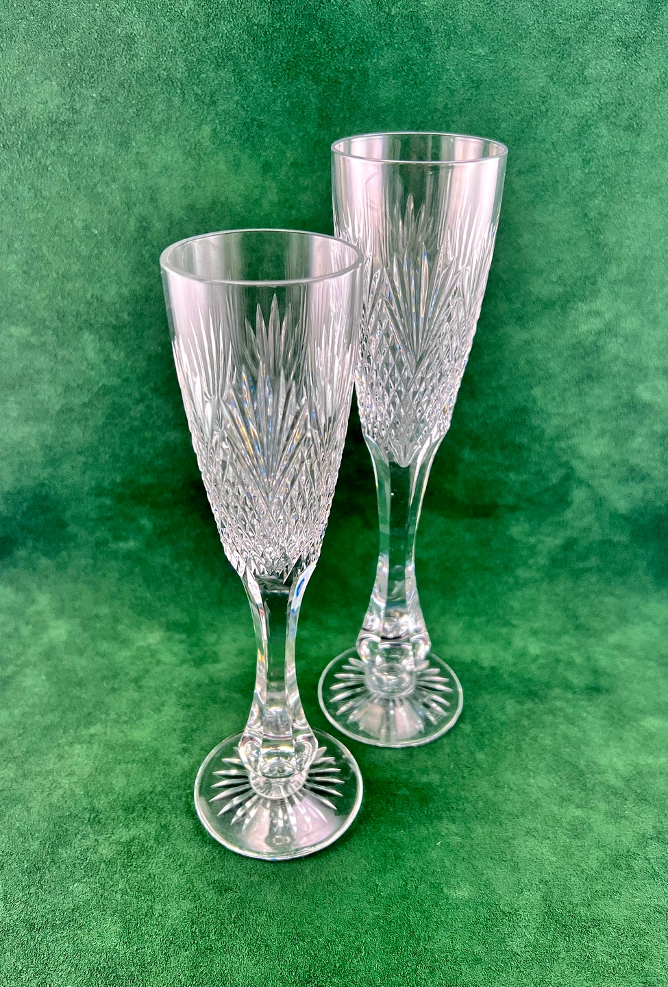 Exceptional pair of Royal Doulton fine crystal champagne flutes. Beautifully cut pattern with high lustre & ping. Thickly cut stems, very good weight. One is taller than the other. Both glasses stamped on bottoms. No chips, cracks, scratches or etching