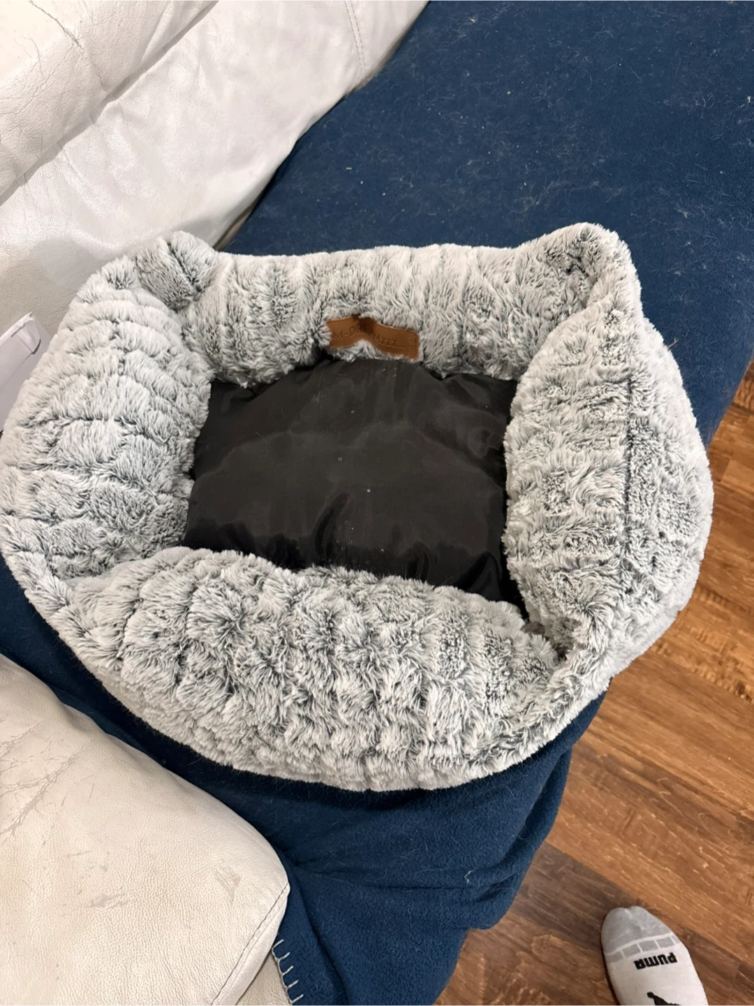 Plush shark dog toy with squeaker, alongside a soft, grey fluffy pet bed. Both items are gently used. The shark toy measures approximately 18 inches long. The pet bed is suitable for small to medium-sized pets.