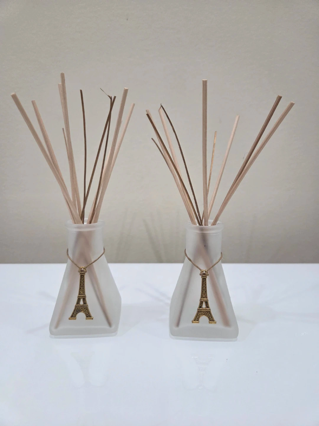Two frosted glass reed diffusers, each adorned with a delicate Eiffel Tower charm. These diffusers are designed to hold scented oils and release fragrance via rattan reeds. They're suitable for adding a touch of Parisian flair and pleasant aroma to any room.