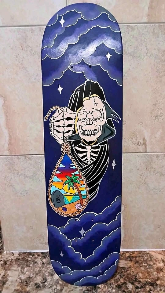 Hand painted Grim Reaper Permanent Vacation Skateboard art! Perfect gift for the Uncle Frank (Steve Carroll's version) in the family! IYKYK. Recycled skatedeck.