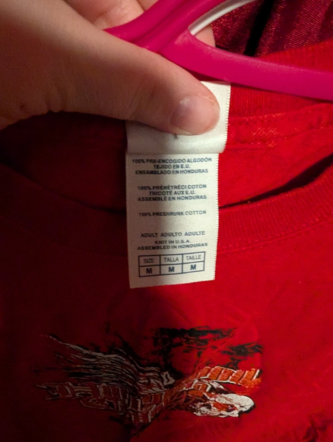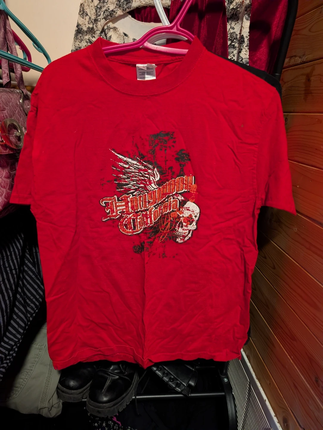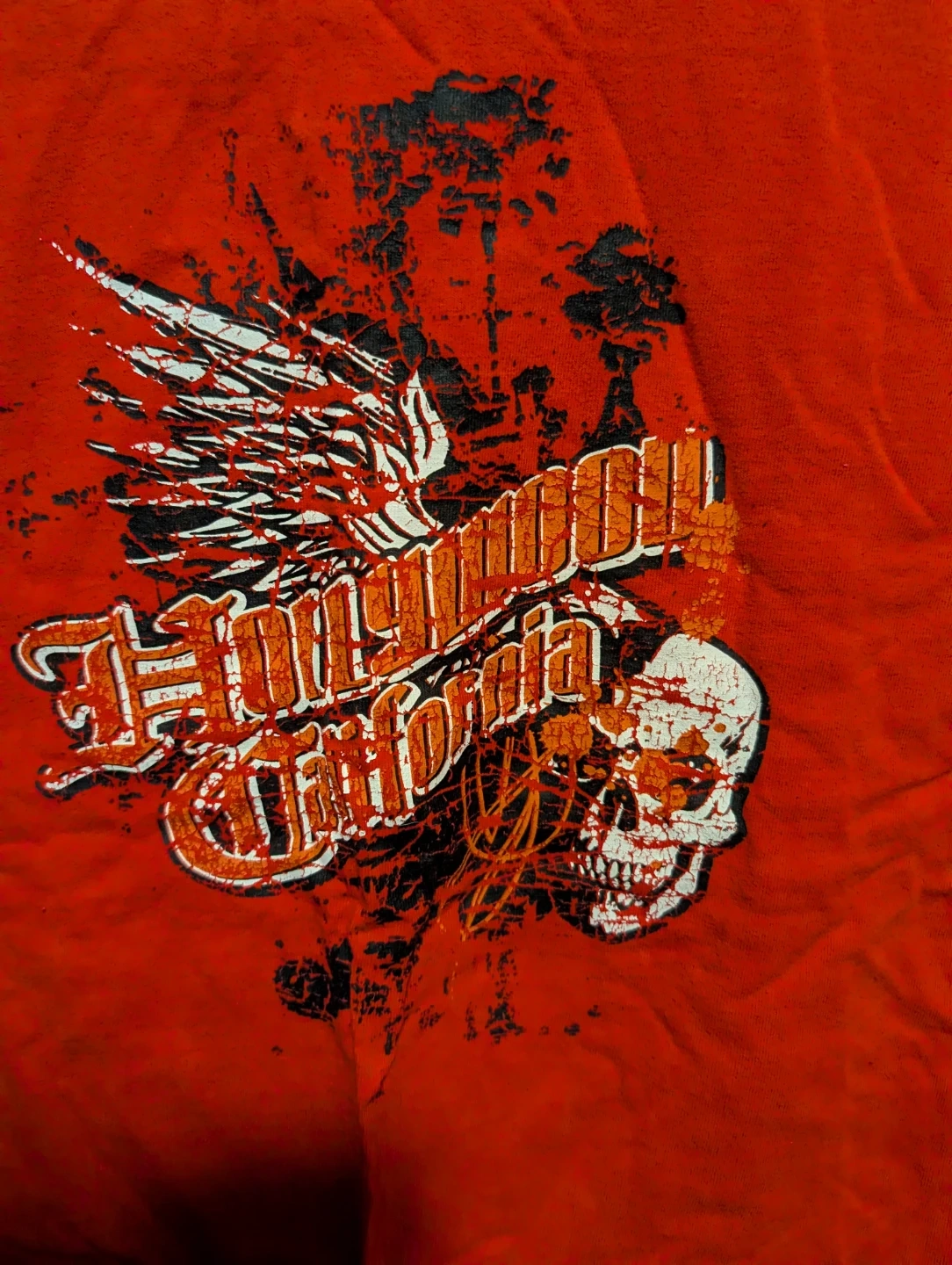 Red graphic t-shirt with a skull and wings design. 100% preshrunk cotton. Sick skate shirt, size M/M.