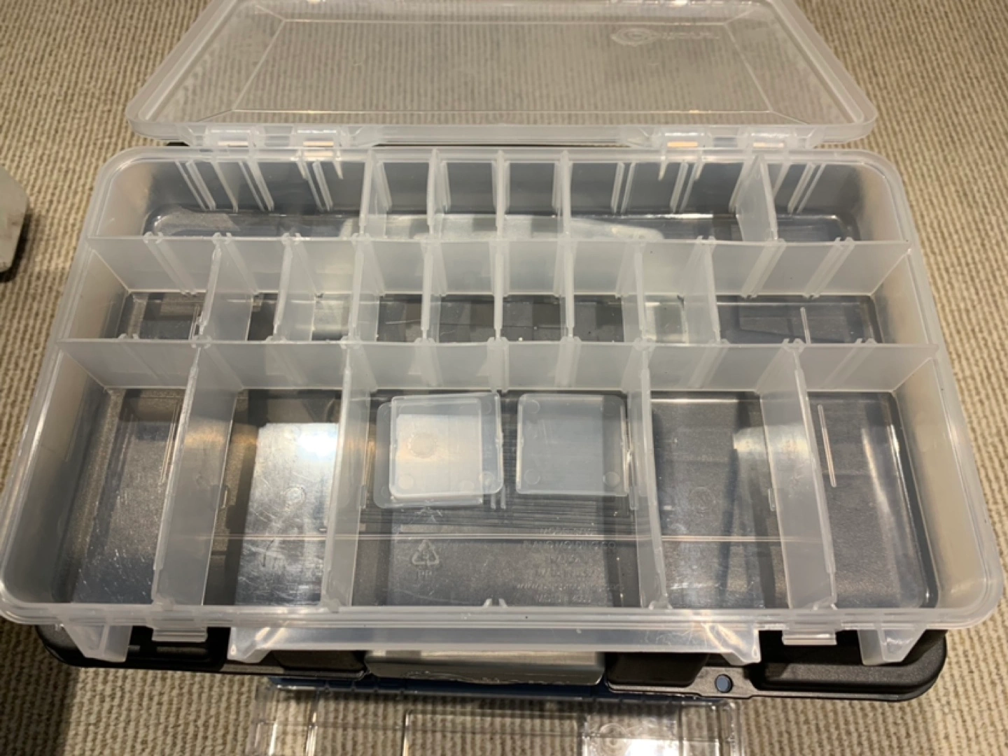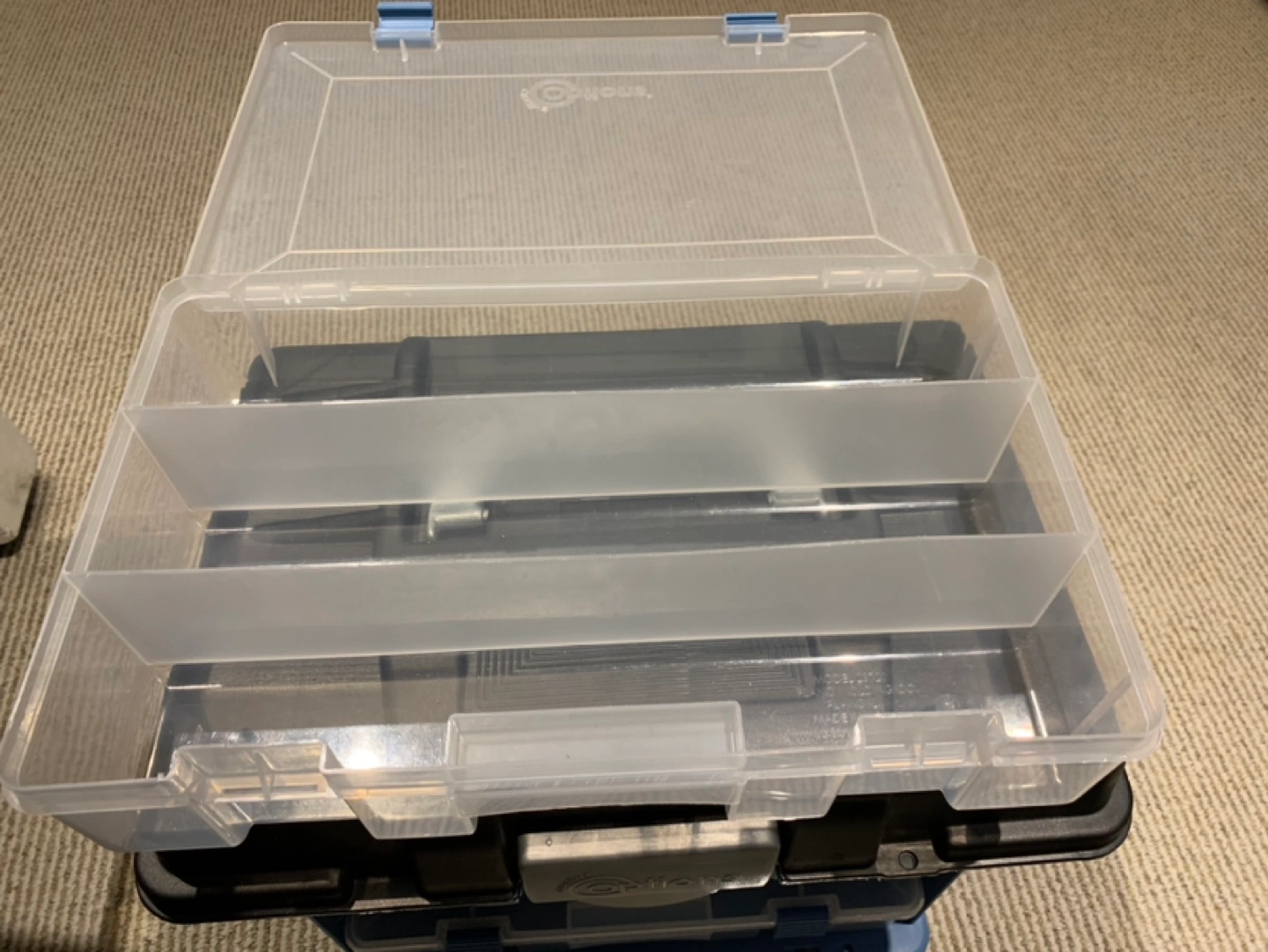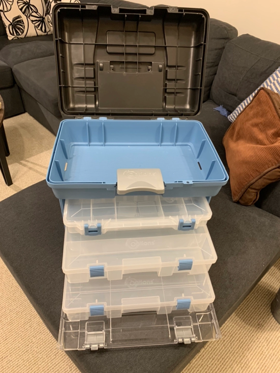 Medium sized plastic storage box with a black lid and blue trim. Has three removable drawers. There is a carrying handle on the top.