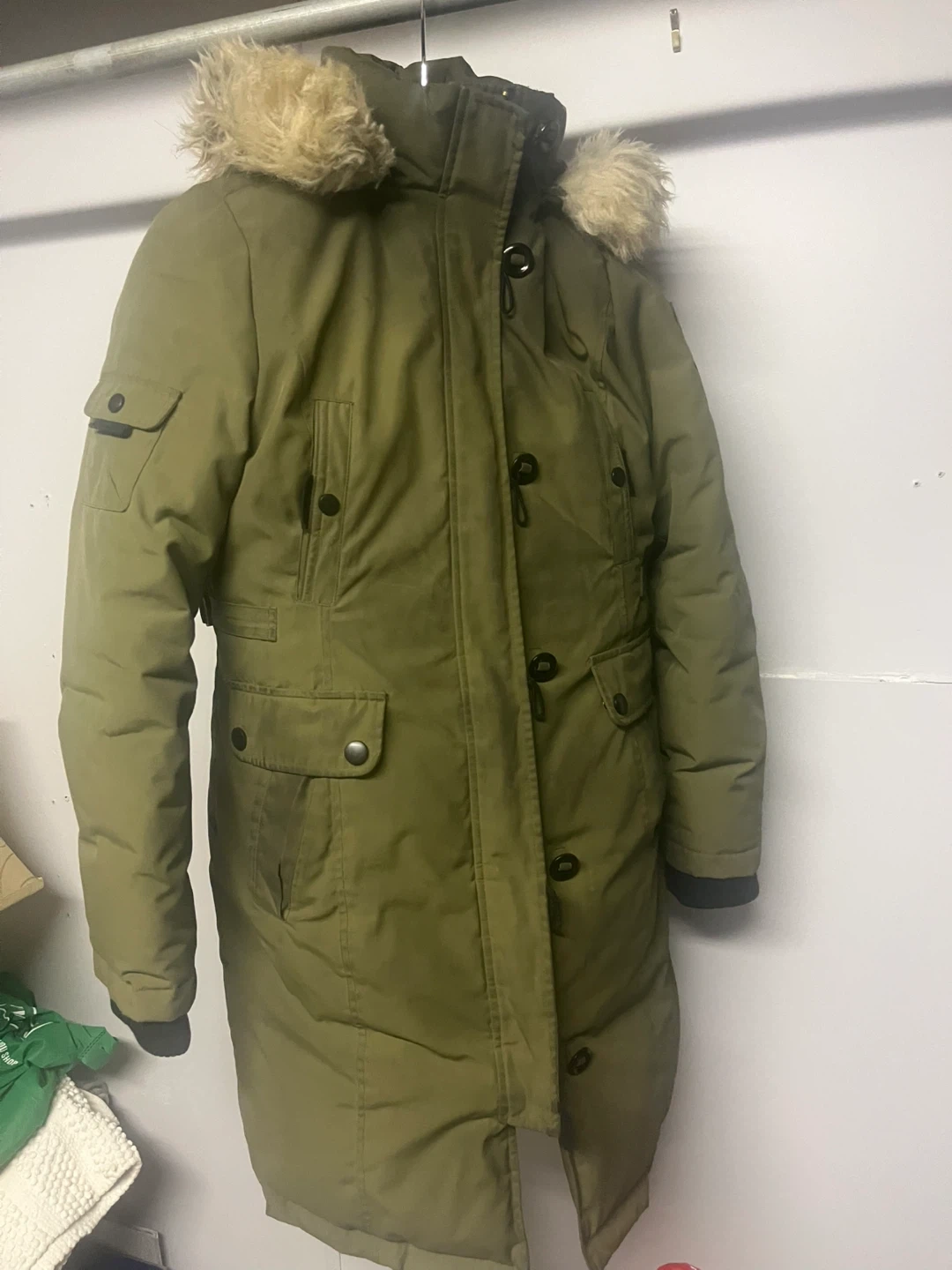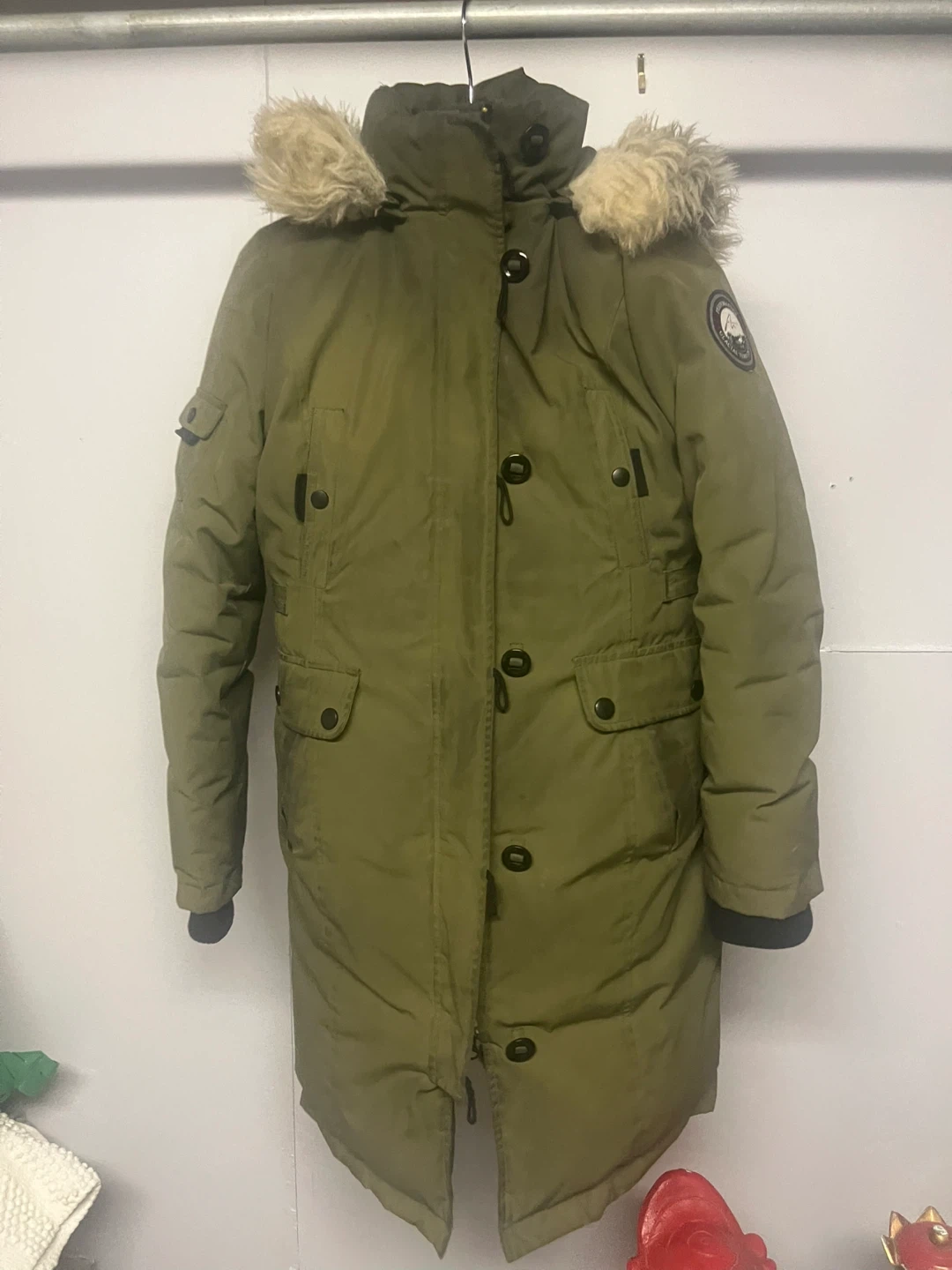 Warm green parka jacket from Glacial Terrain Gear. Features a fur-lined hood and multiple pockets. Great for keeping cozy in the cold!