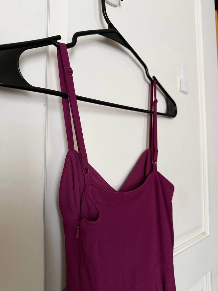 - The dress is a deep berry / wine-toned purple. More specifically, it sits between: Burgundy, Plum, Dark magenta