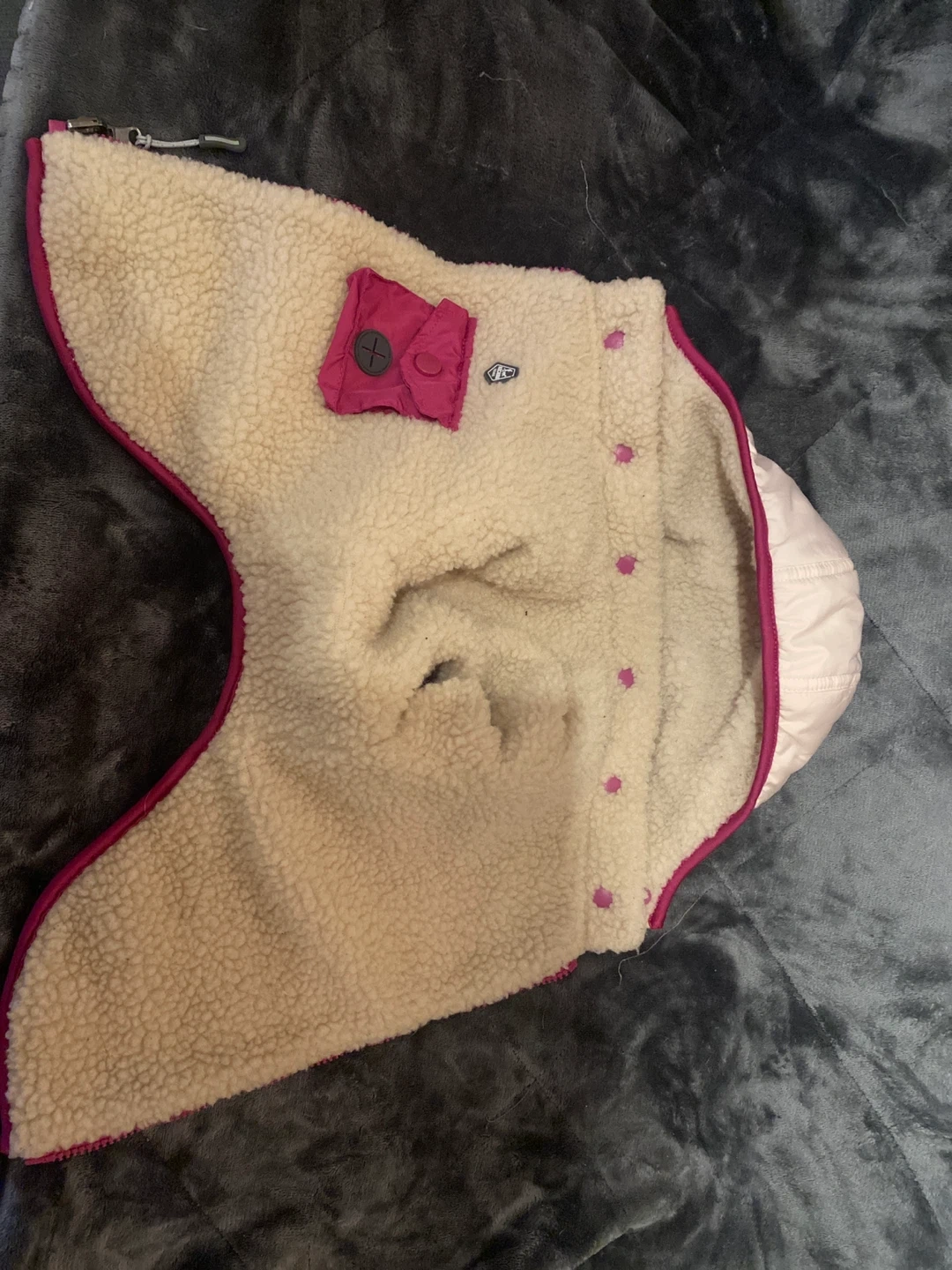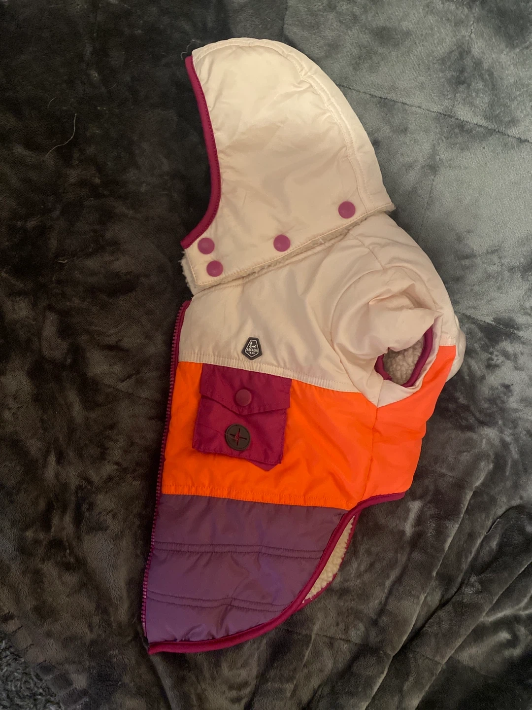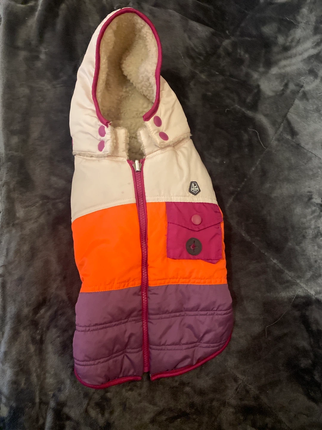 This colourful dog vest is lined with cozy sherpa for warmth. It features a functional zipper and a decorative pocket with button closure. It's perfect for keeping your furry friend comfortable on chilly walks!