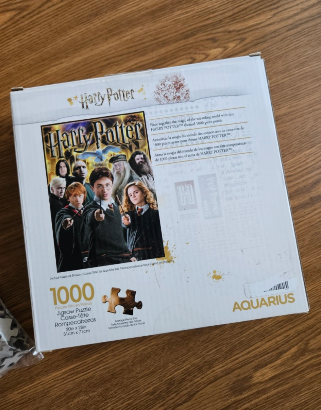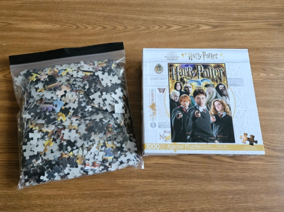1000-piece jigsaw puzzle featuring Harry Potter and his friends. Image shows Harry, Ron, Hermione, and other characters. Comes in original box. Two pieces are missing.