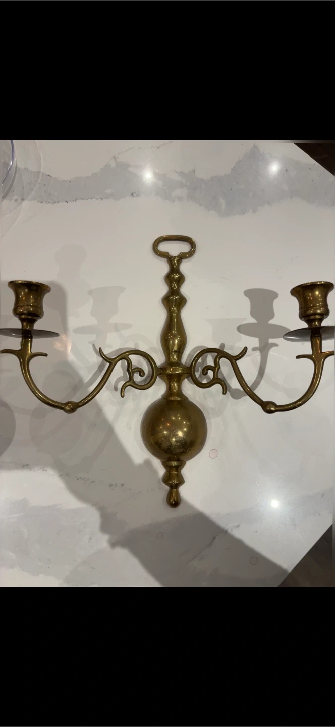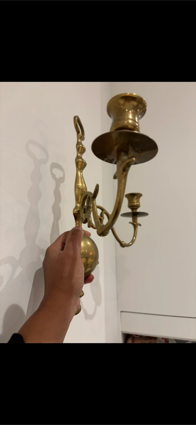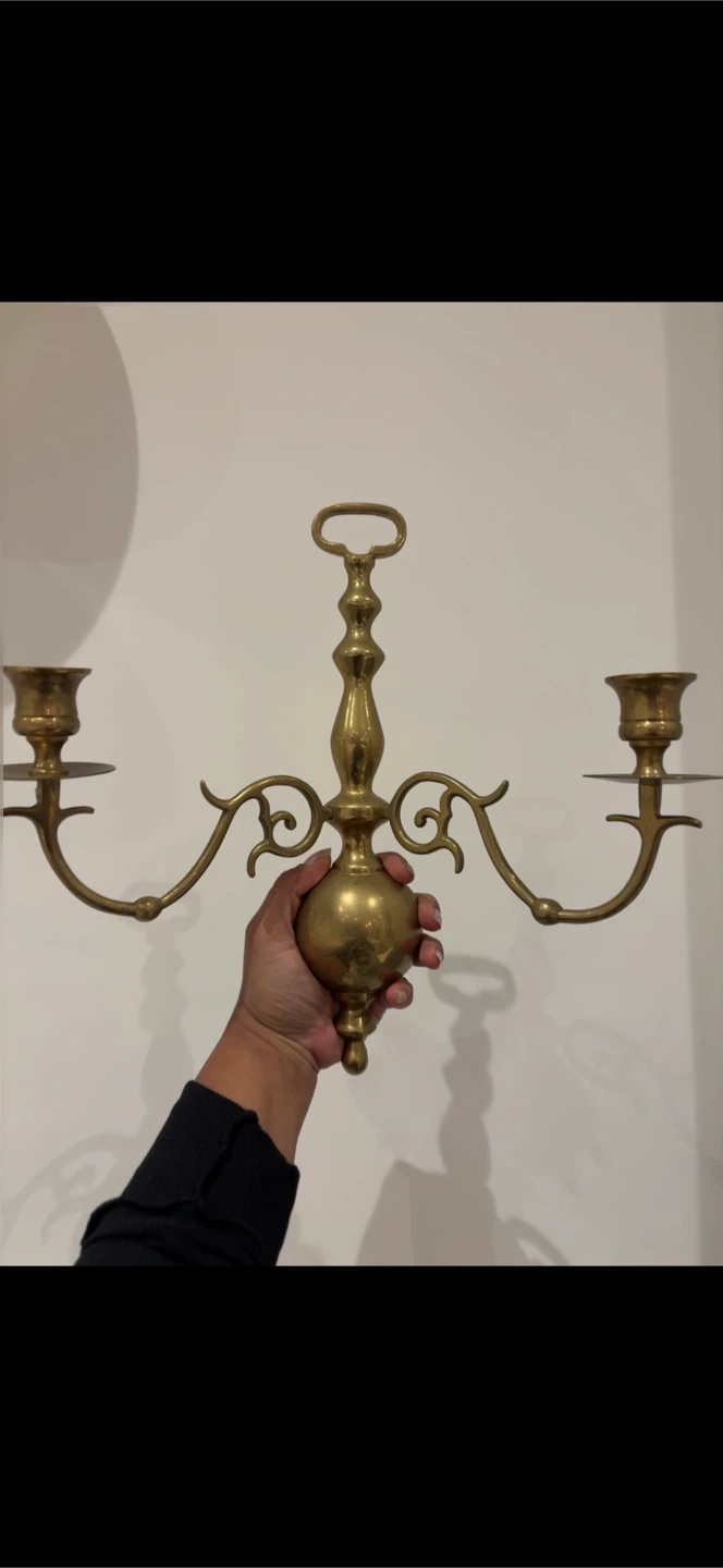 Vintage brass taper candle holder with a unique design. This holder has two arms, each with a cup for a taper candle. It's made of solid brass and has a nice patina from age. It's perfect for adding a classic touch to your decor.