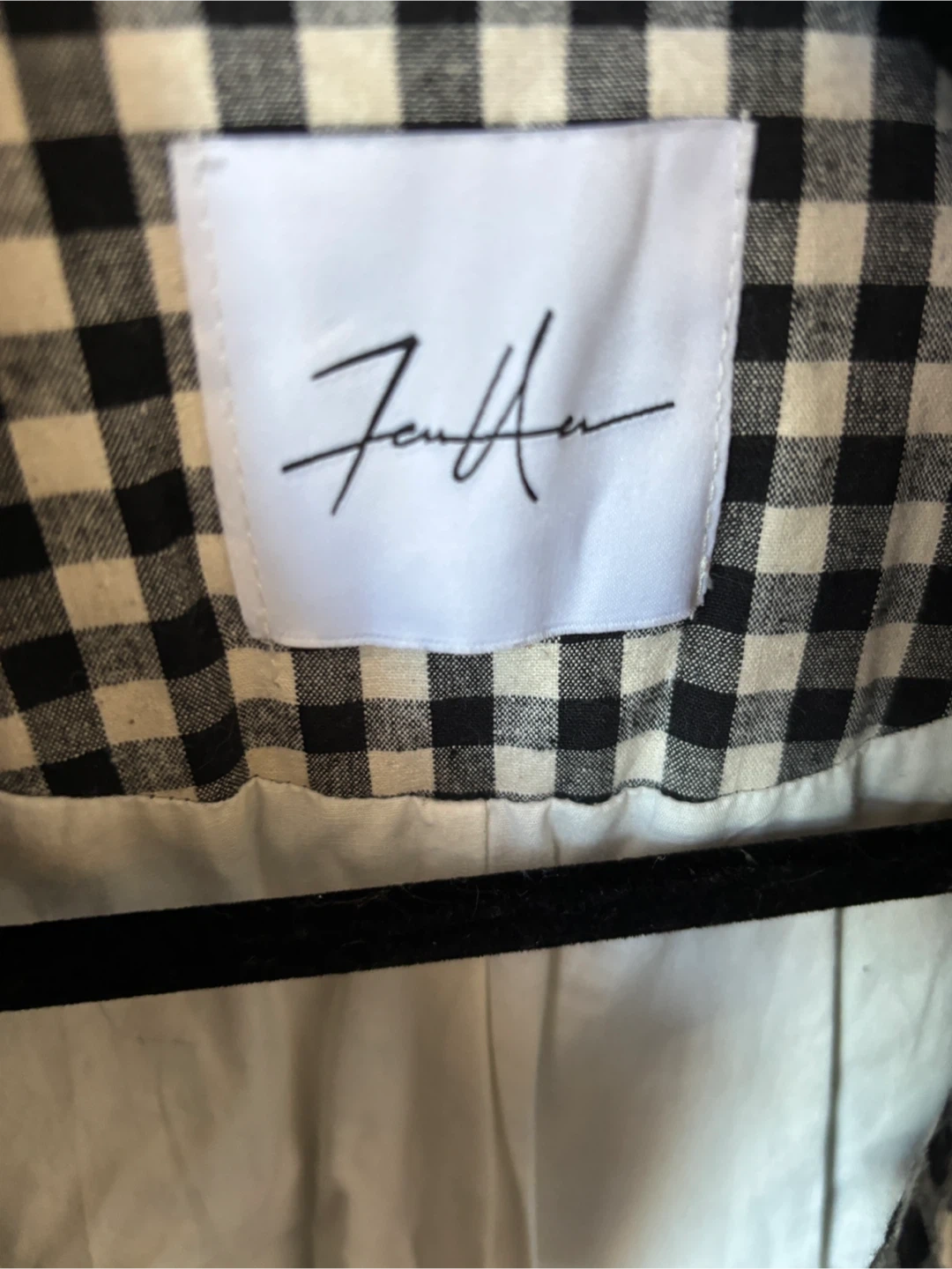 Chic Jaffa trench coat with a classic black and white gingham pattern. Features a white lining and button closure. 100% cotton material.