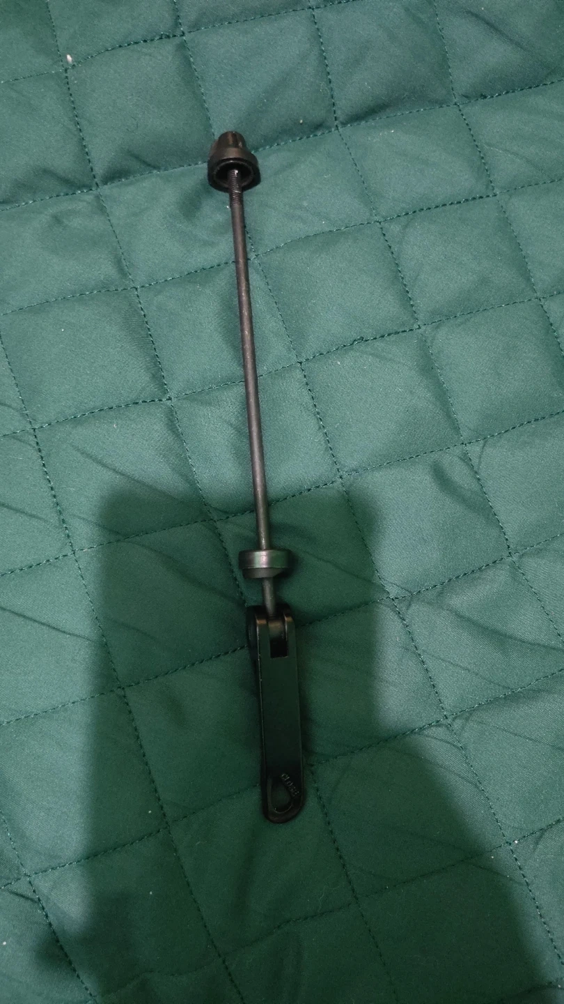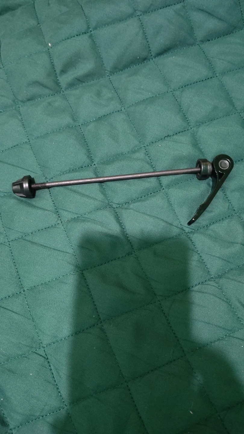 This is a standard bike wheel skewer. It's used to quickly attach and detach wheels from a bicycle frame. Metal construction for durability.