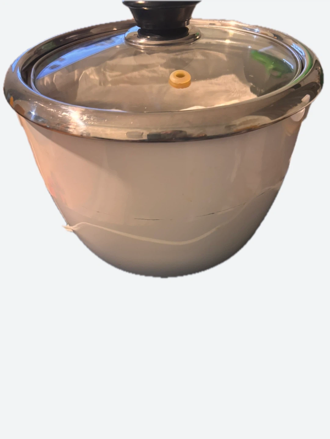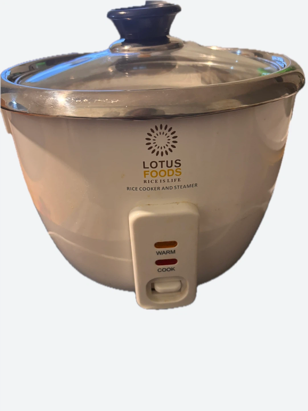 This is a Lotus Foods rice cooker and steamer. It's white with a glass lid and stainless steel rim. The inner pot is made of metal. It has 'Warm' and 'Cook' indicator lights.