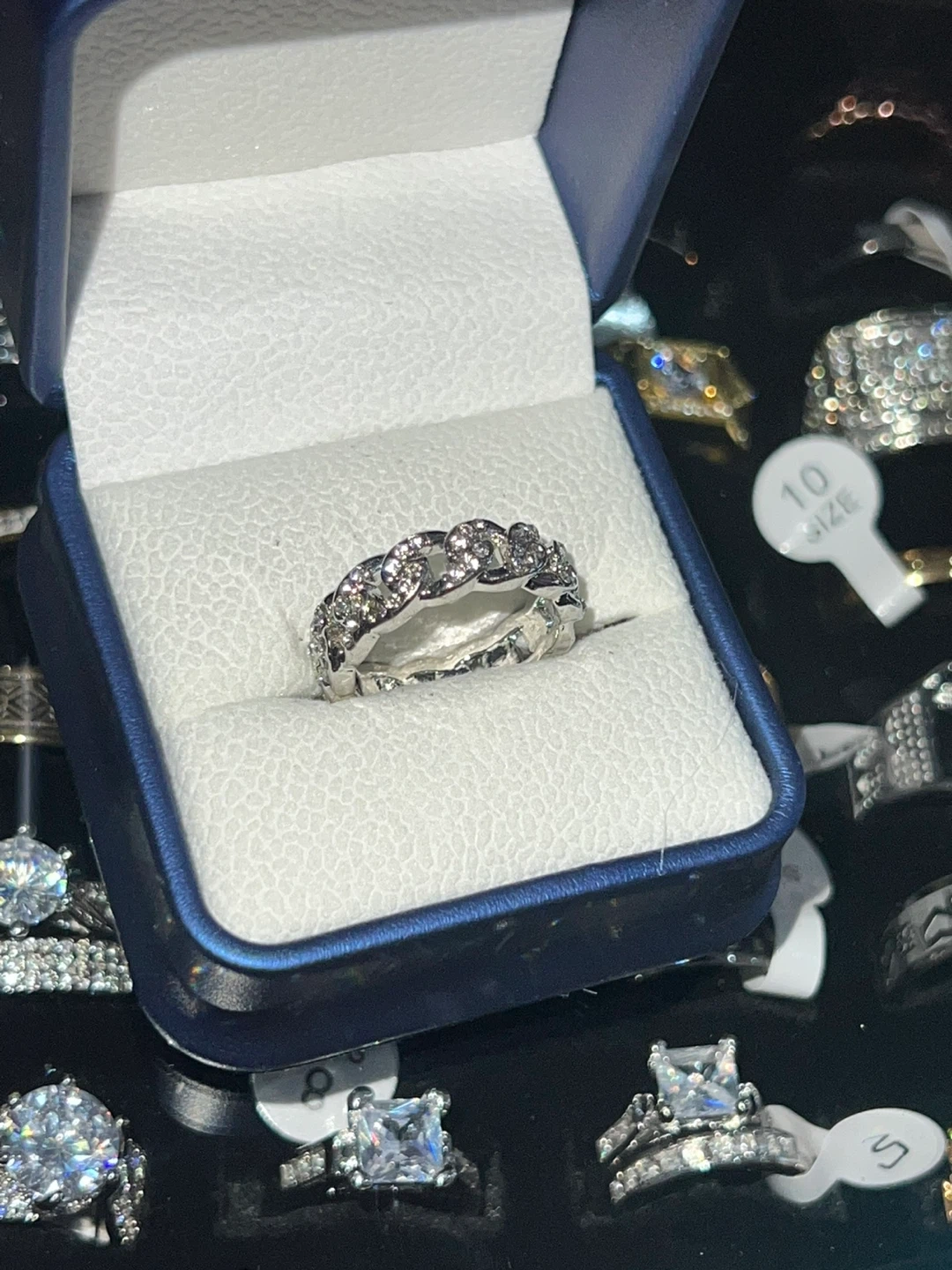 This sparkly ring features a chain link design encrusted with stones. It's set in a silver-toned metal and comes in a jewellery box. This ring adds a touch of glam to any outfit!