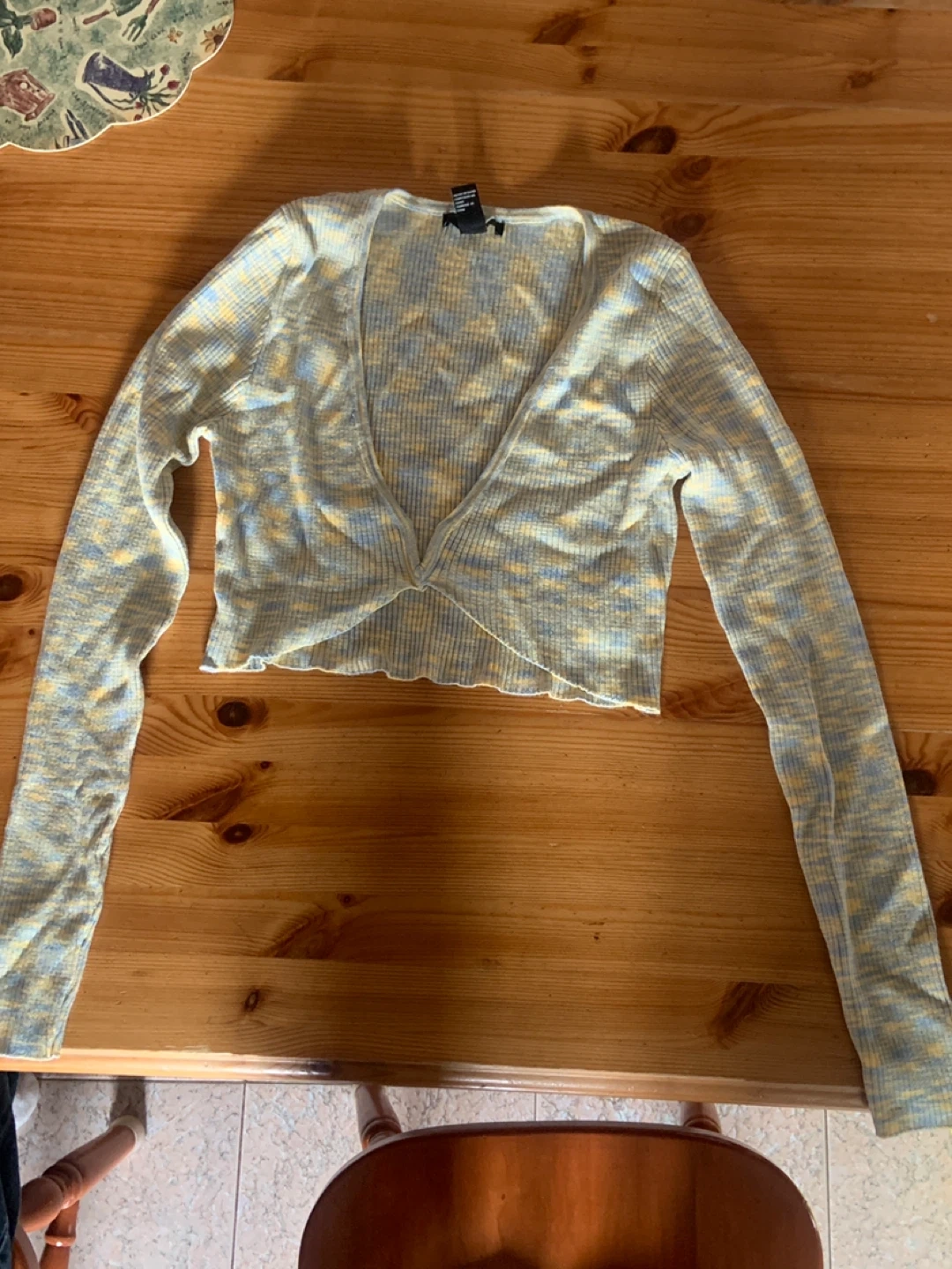 This is a Forever 21 ribbed knit cardigan. It features a twist front detail and a marled pattern in yellow and blue. The material is a soft blend, perfect for layering.
