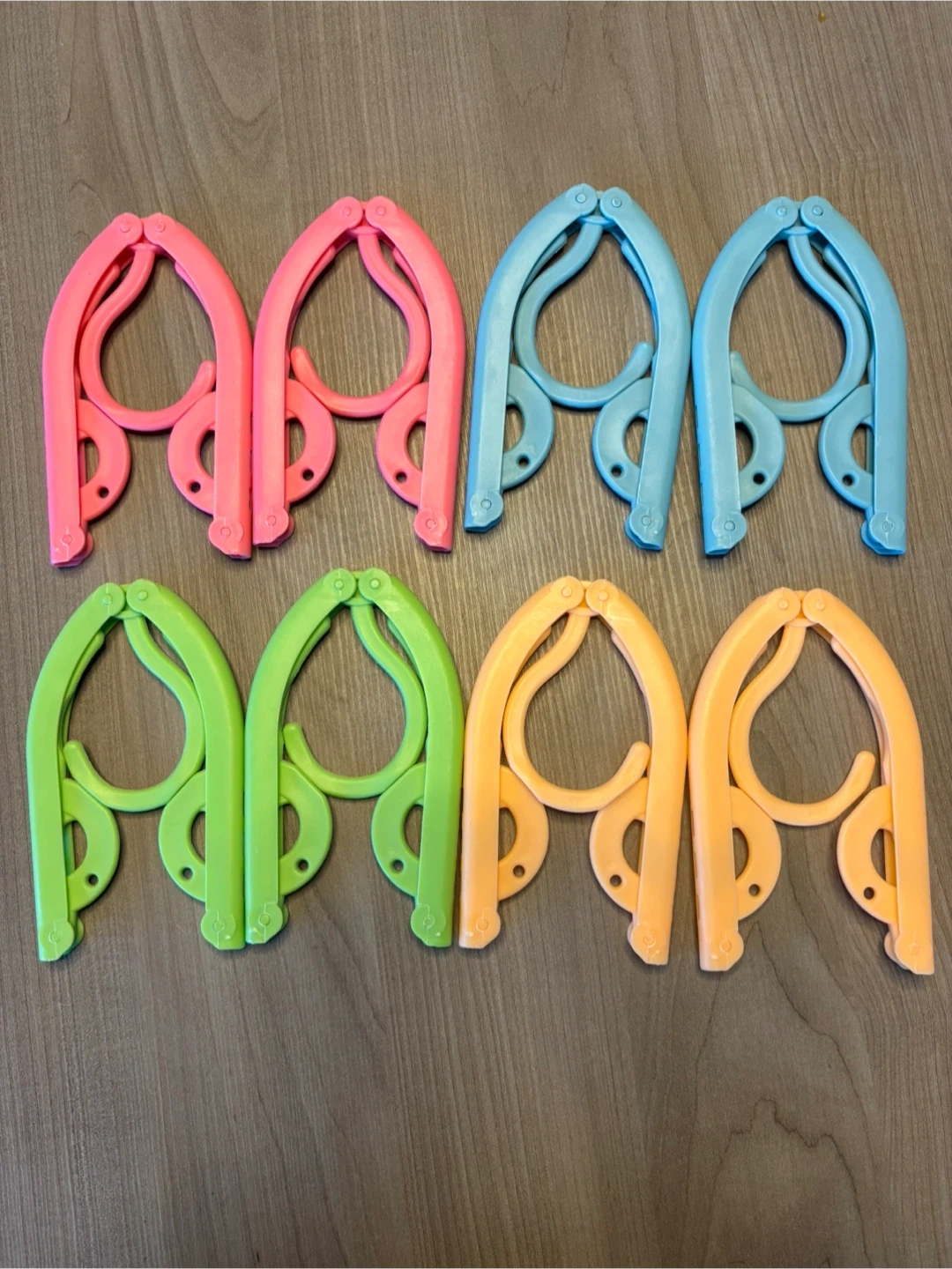 Selling a set of 8 folding travel clothes hangers! They come in a variety of colours, including pink, green, blue, and orange. Perfect for keeping your clothes organized while you're on the go.