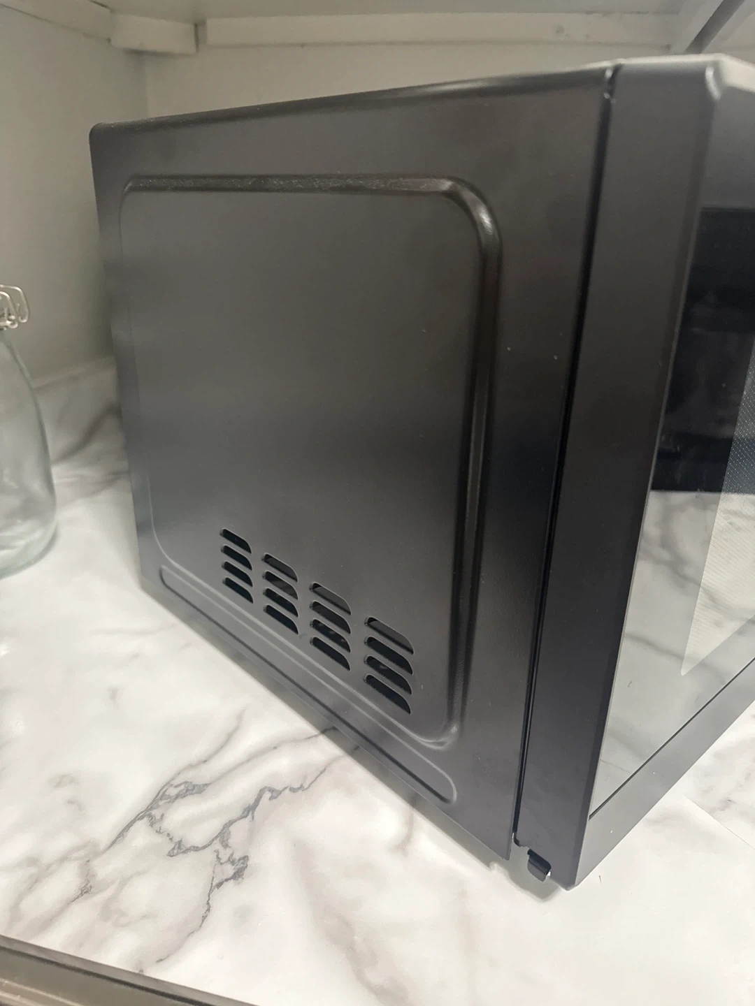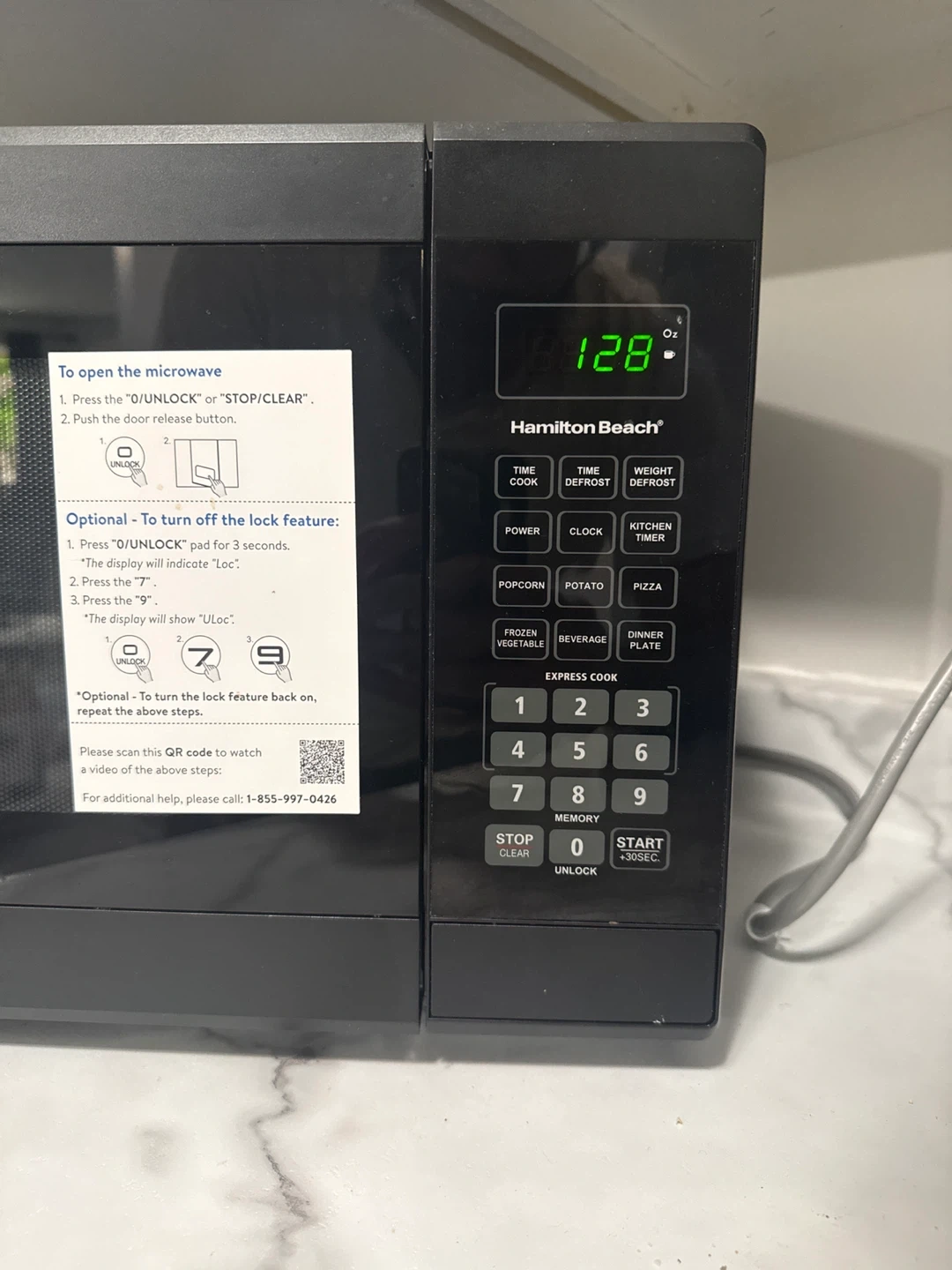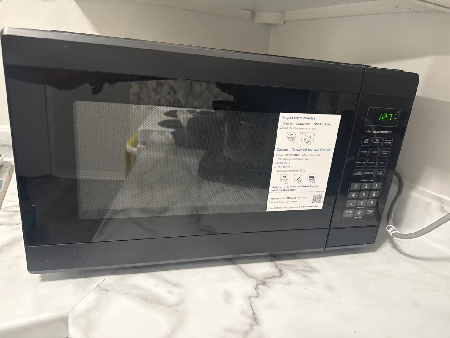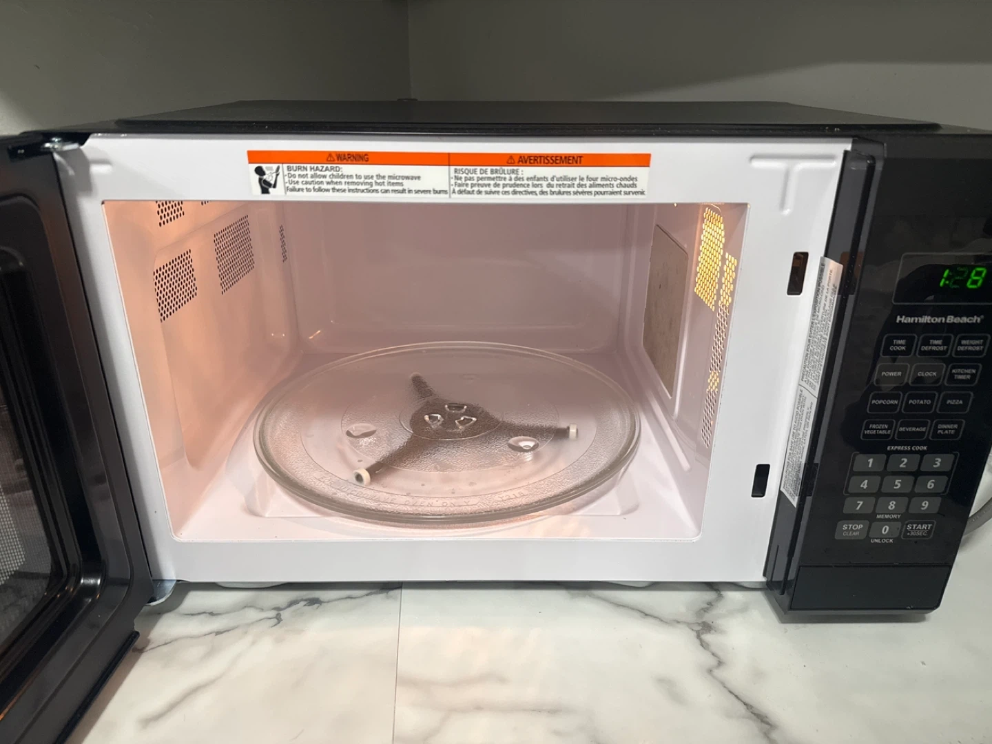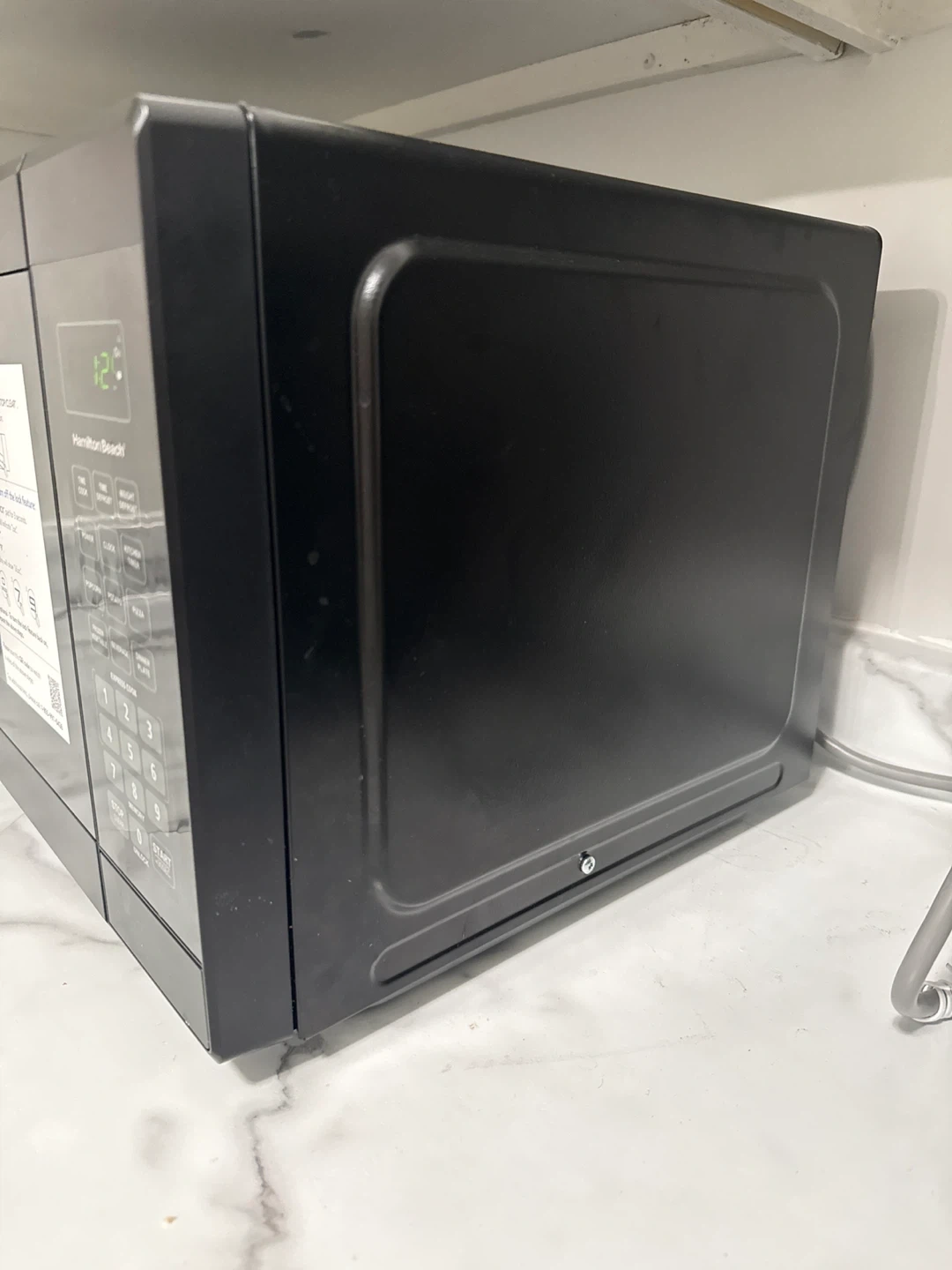 Move-out sale! This is a black Hamilton Beach microwave oven. It features a digital display and a glass turntable. It has multiple preset cooking functions like popcorn, potato, and pizza.