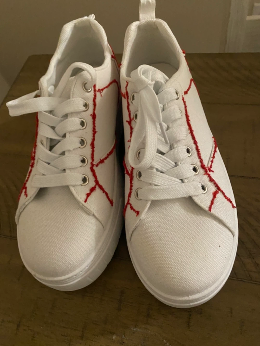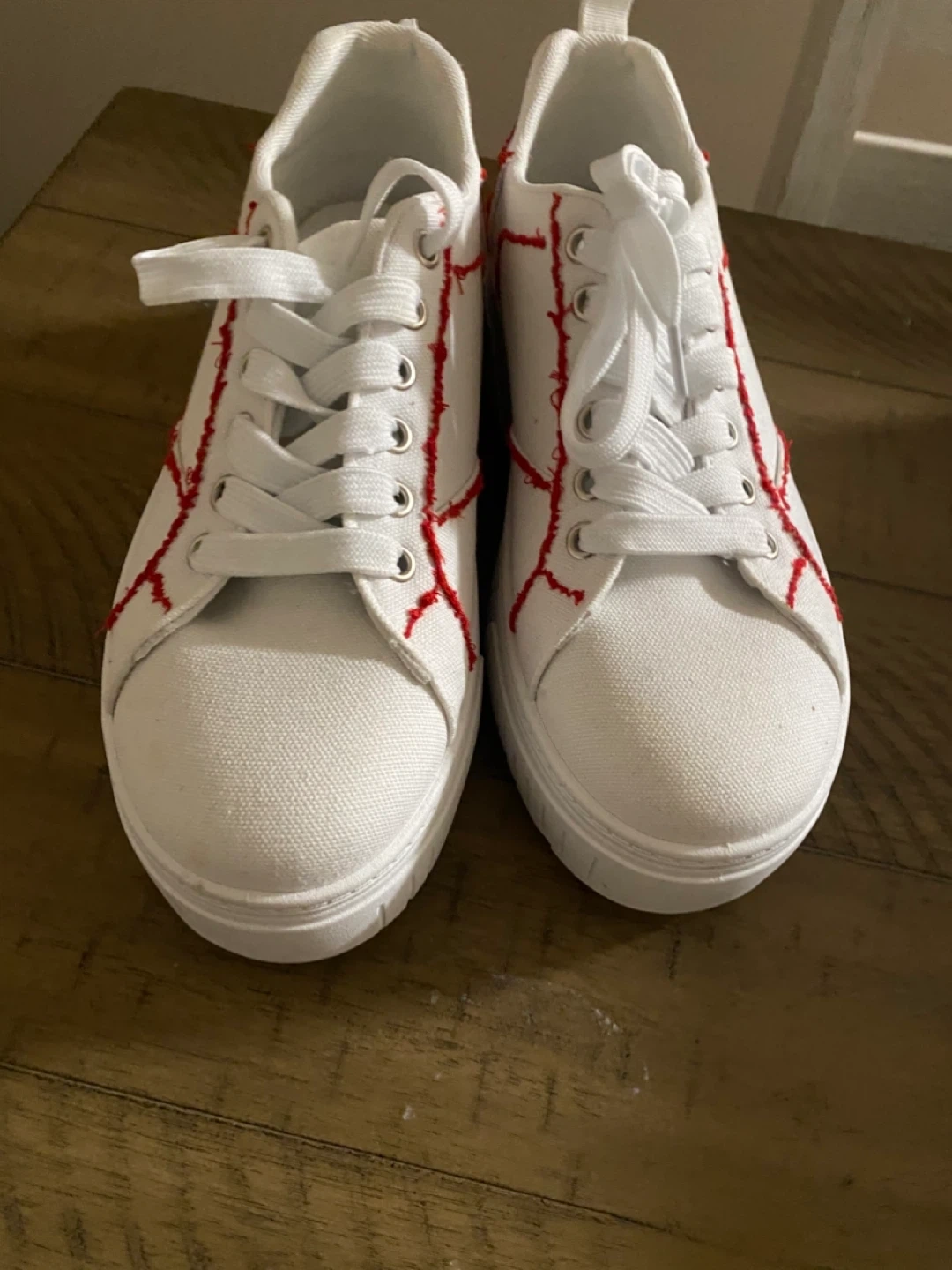 These are white canvas sneakers with a hand made unique red stitching detail. They feature a lace-up closure and a durable white sole. The material is canvas.
