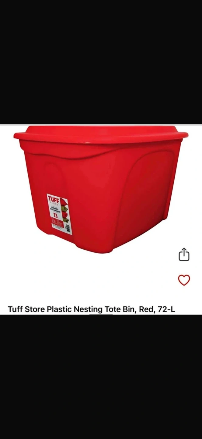 This is a red plastic storage bin. Tuff Store brand Storage box.