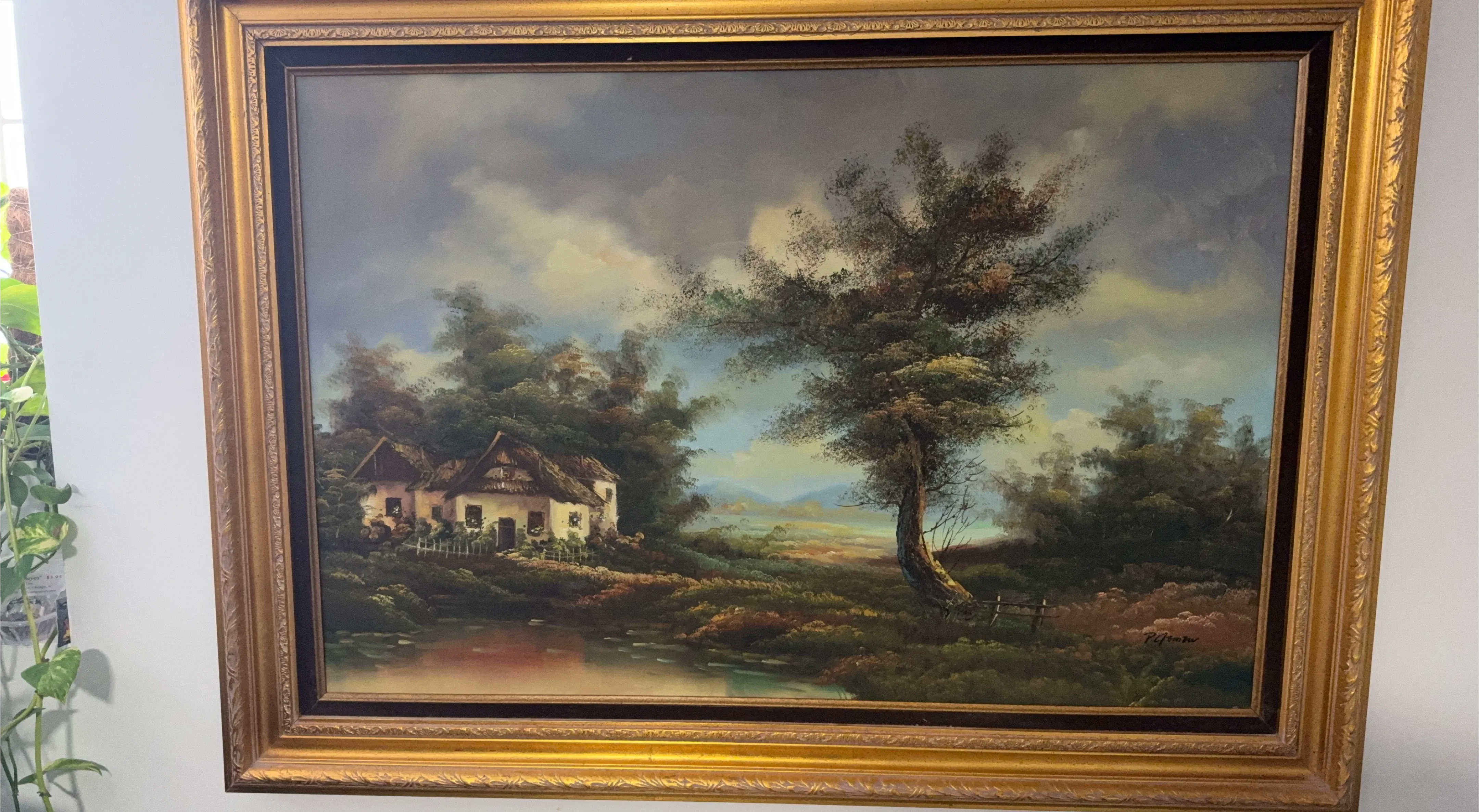 This is a framed landscape oil painting featuring a house and trees. The frame is gold. The painting is signed by the artist, R. Peterson.
