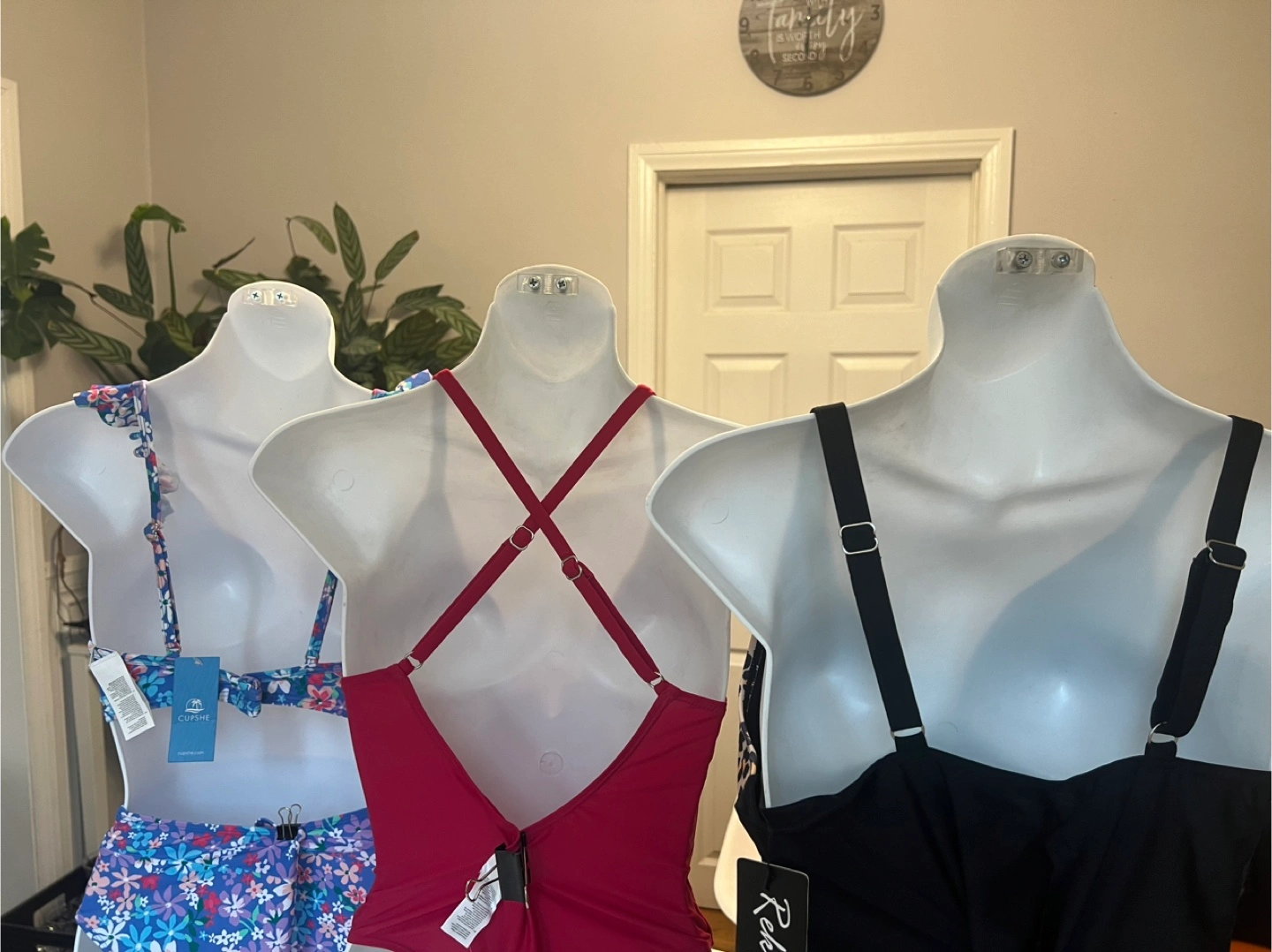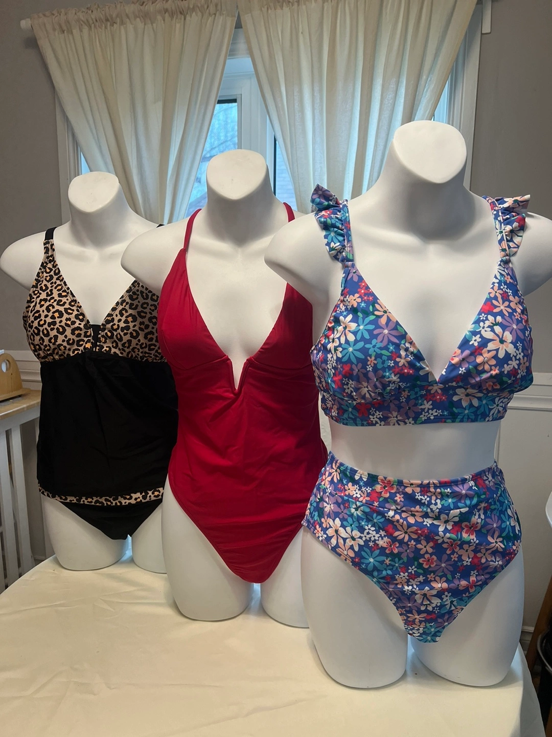 women's swimsuits. One is a red one-piece, another a black one-piece, and the third a floral two-piece. Various styles and colours. Perfect for summer! $20