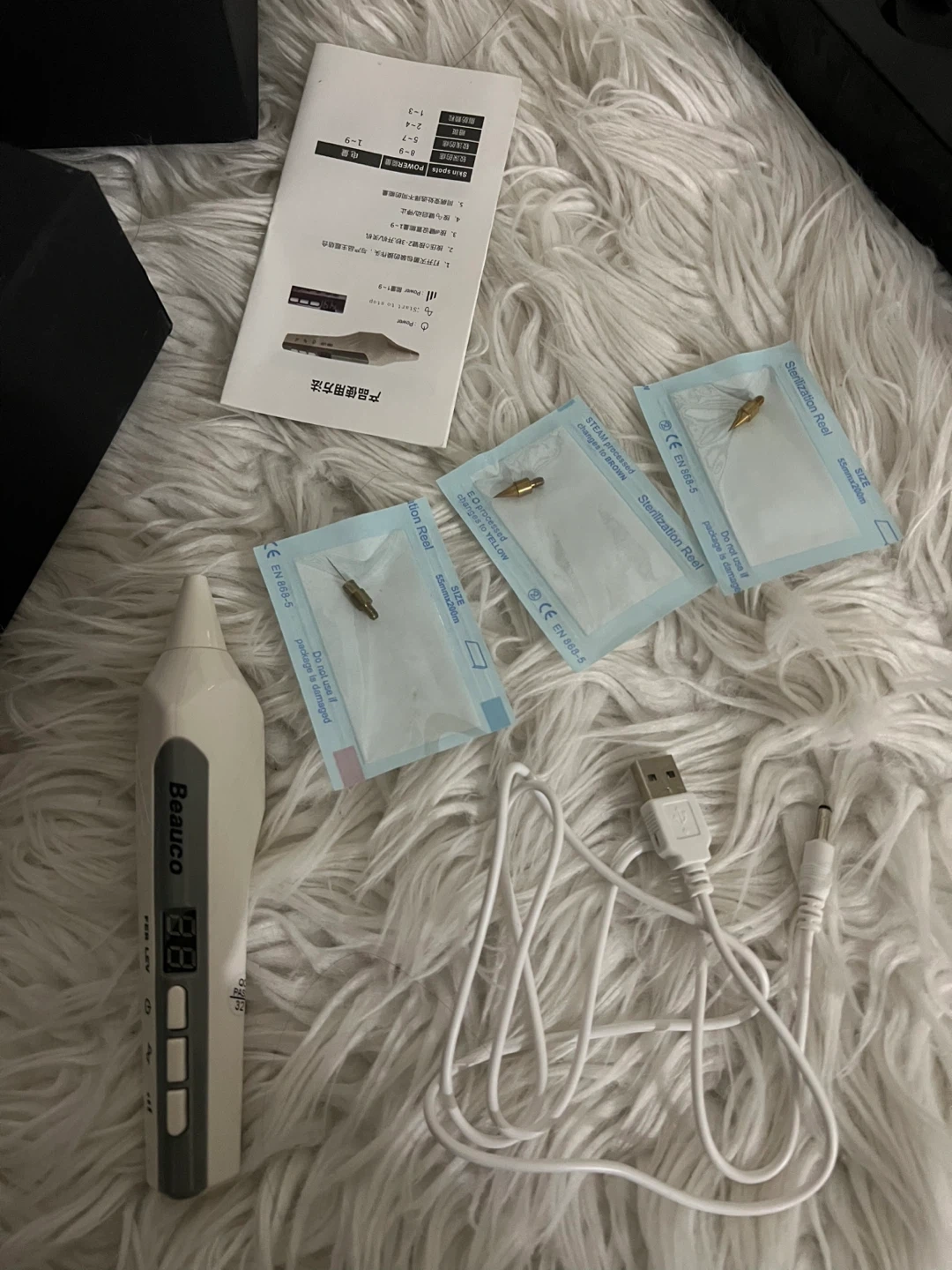 Beauco Fer Lev beauty pen for skin spot removal. It has adjustable power settings and comes with multiple sterile tips and a USB charging cable. A handy tool for home use!