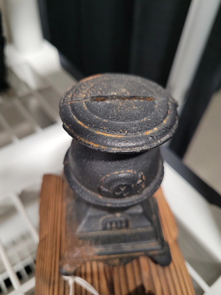 Miniature cast iron stove. Great collectible or decorative piece. Shows some wear consistent with age. Includes small wooden base and decorative wood pieces all attached to the coin bank.