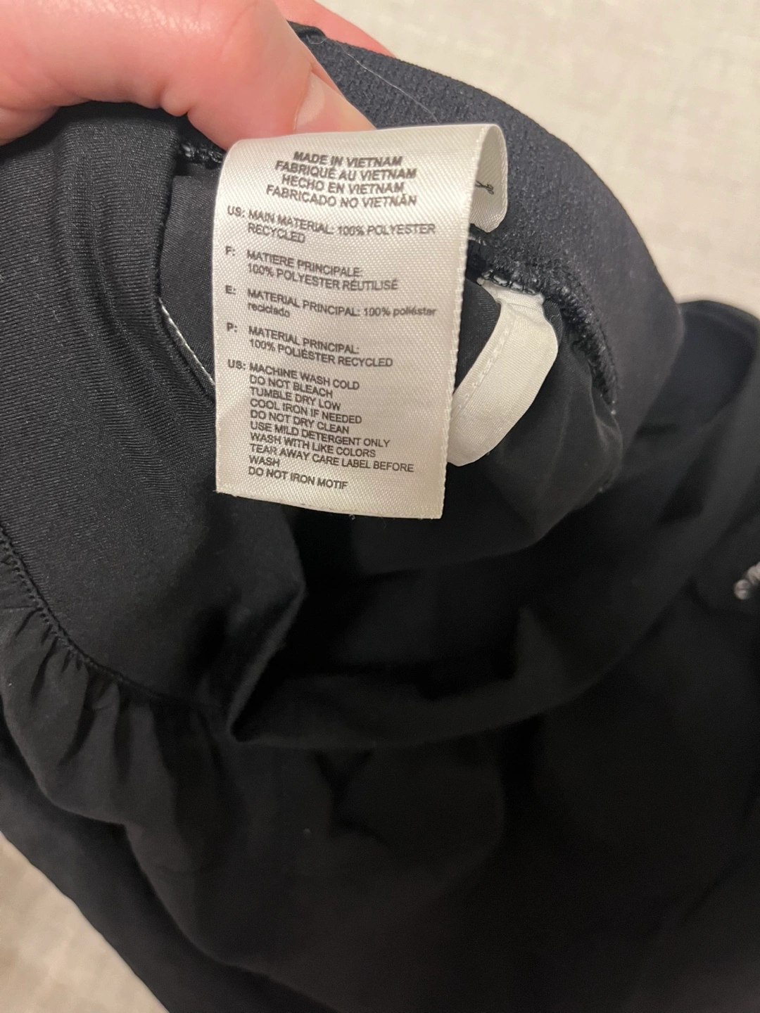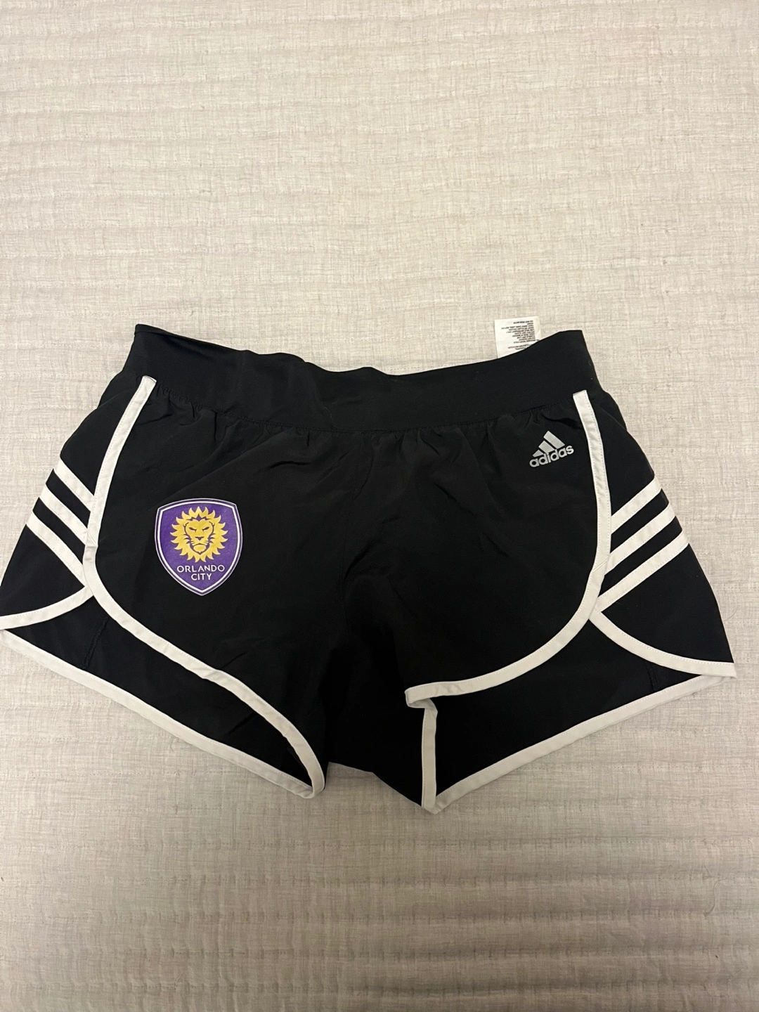 Black running shorts. Size small. White side stripes. Orlando City SC logo. Made in Vietnam. 100% recycled polyester.