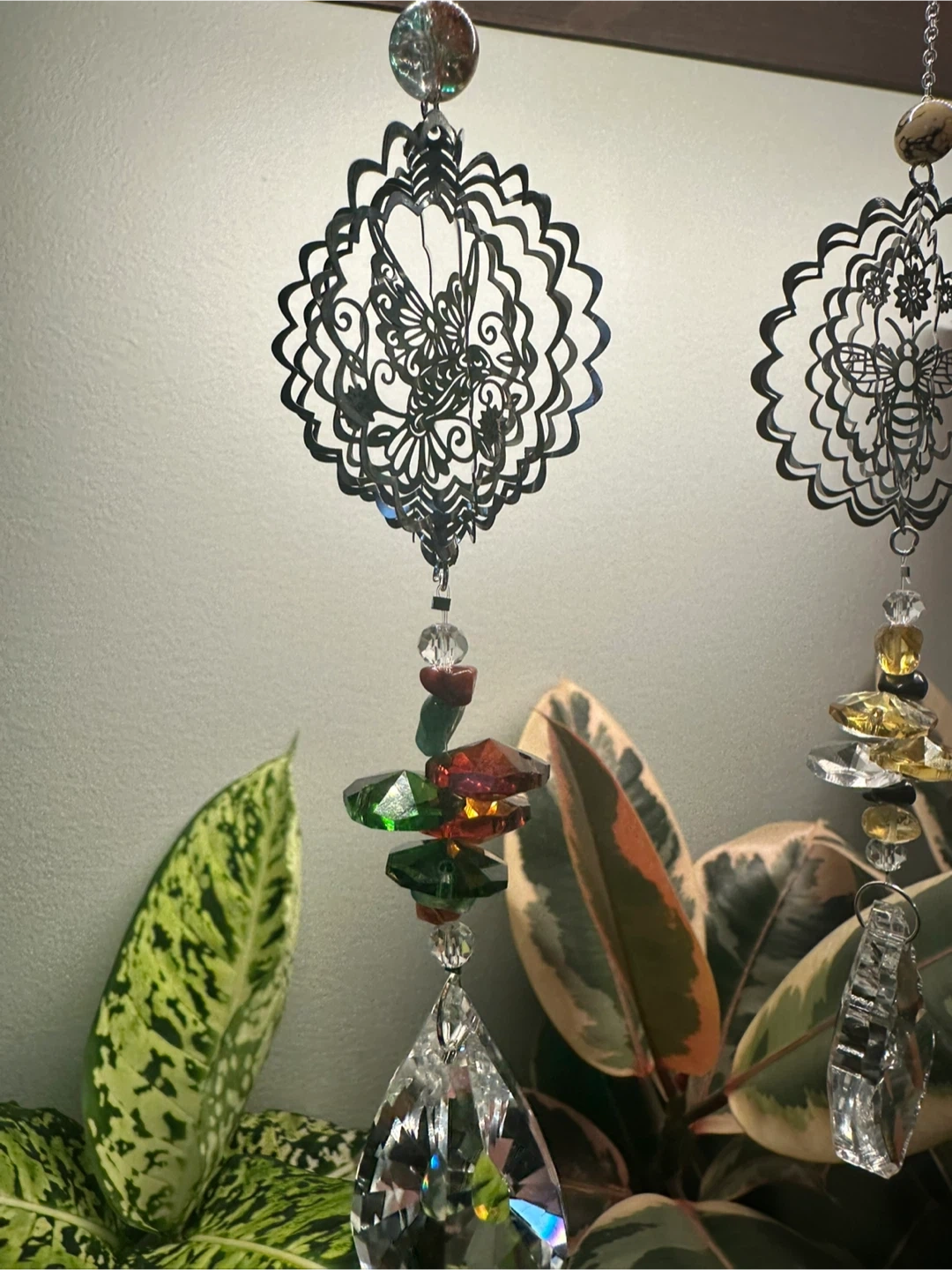 Little decorative Wind Spinner crystal suncatchers. Featuring intricate metal cutouts in different themes like butterflies, Hummingbirds, Hearts and Cats along with faceted glass prisms and colourful beads. They hang and sparkle beautifully!