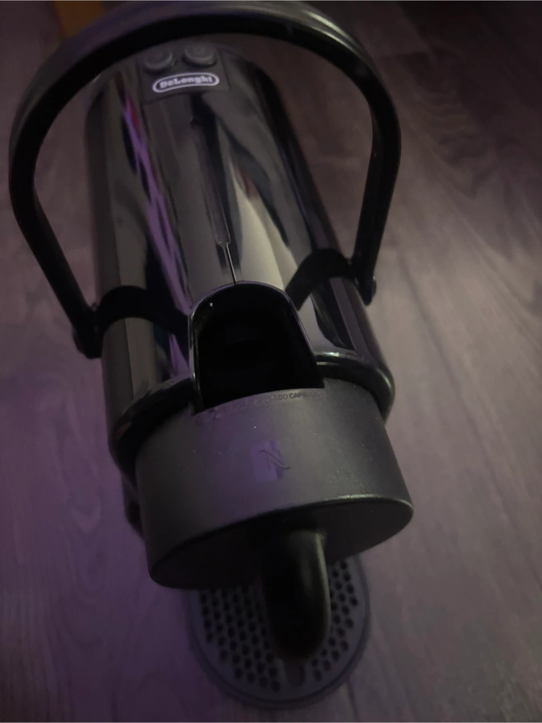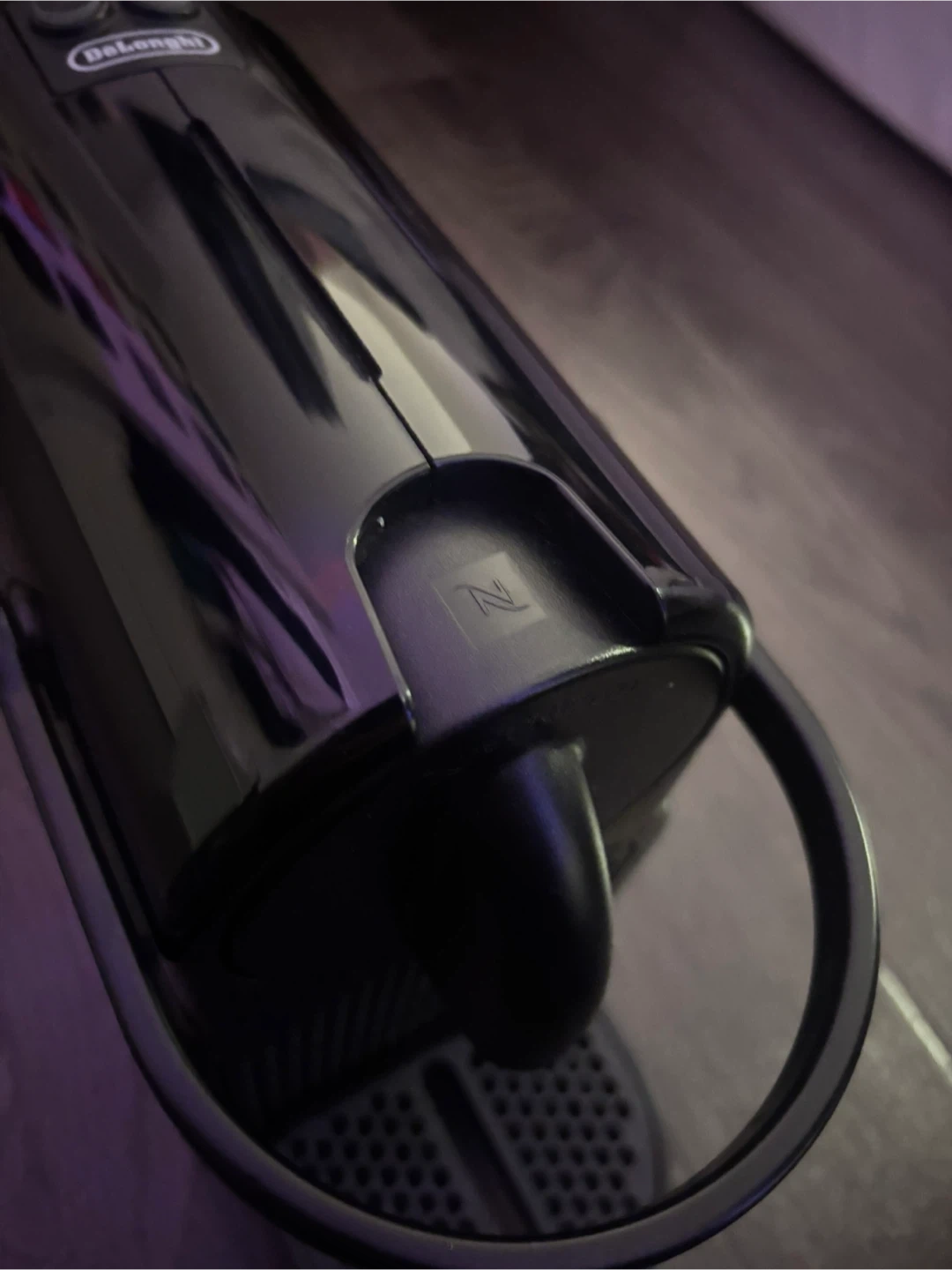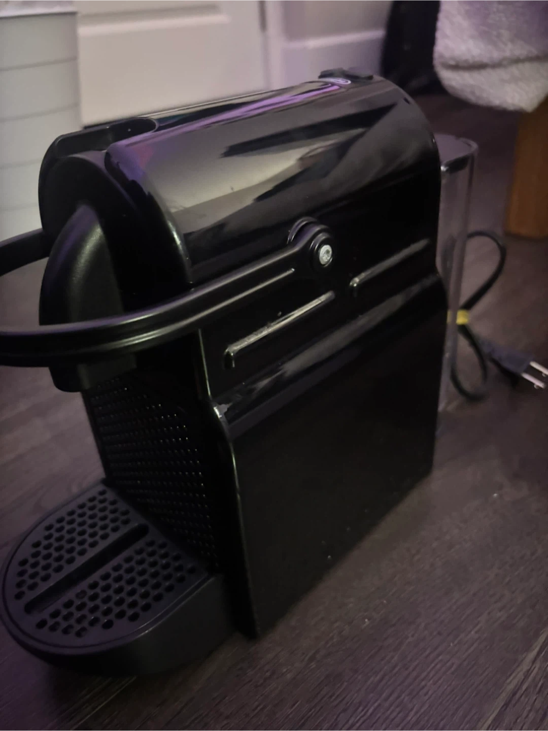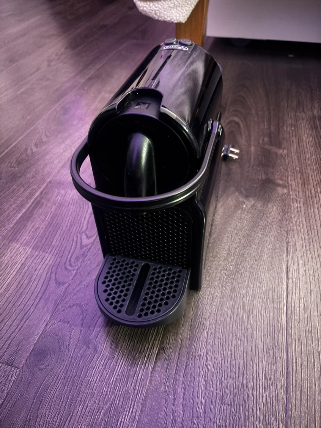 This is a DeLonghi Nespresso coffee machine. It's black and sleek for your kitchen counter. It makes quick espresso shots. In very good condition!