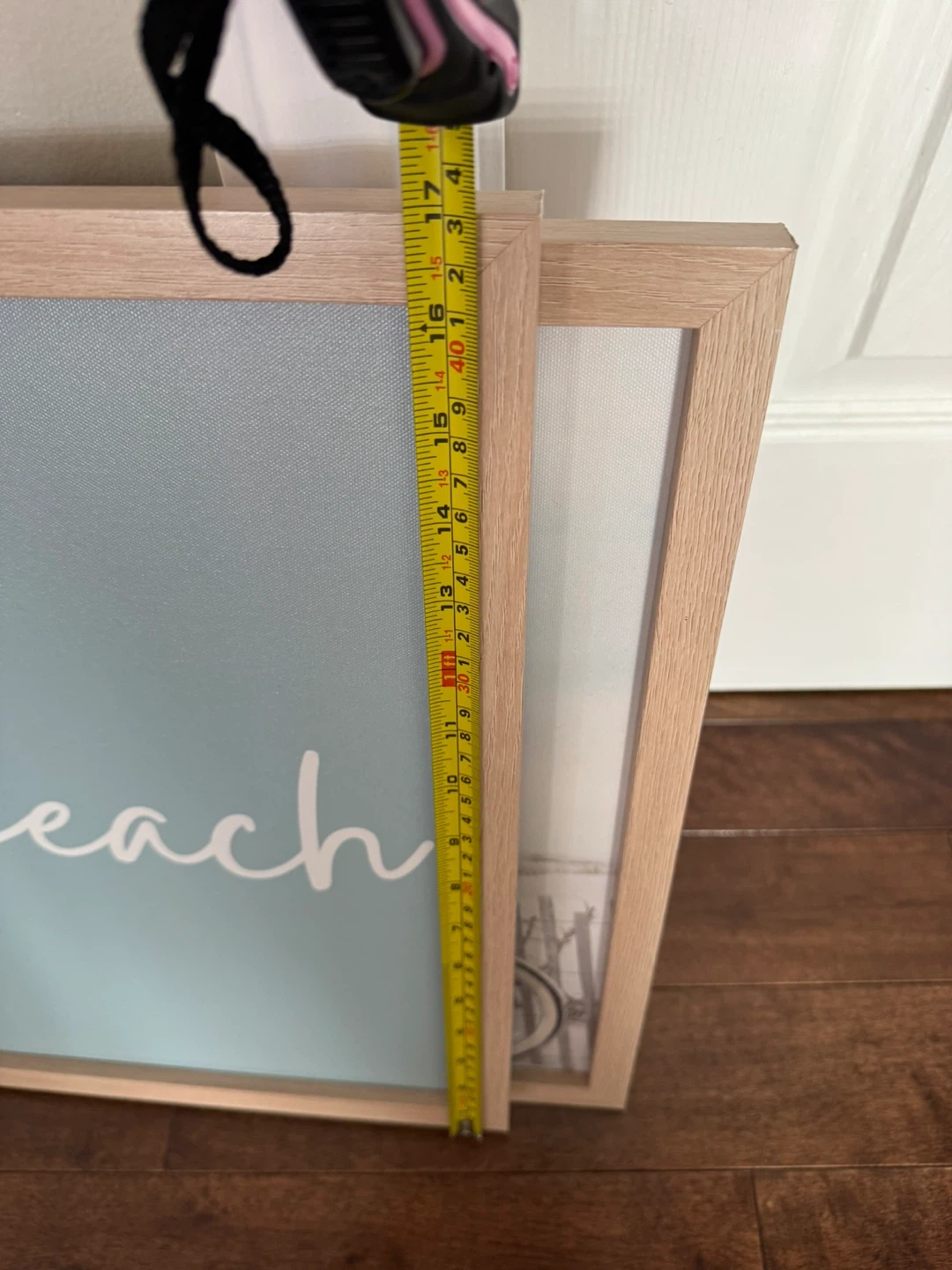Set of two framed wall art prints. One features a bicycle leaning against a beach fence, and the other has "#beach" text on a light blue background. Natural wood frames. Measurements are approximately 13 inches wide by 17 inches tall each.