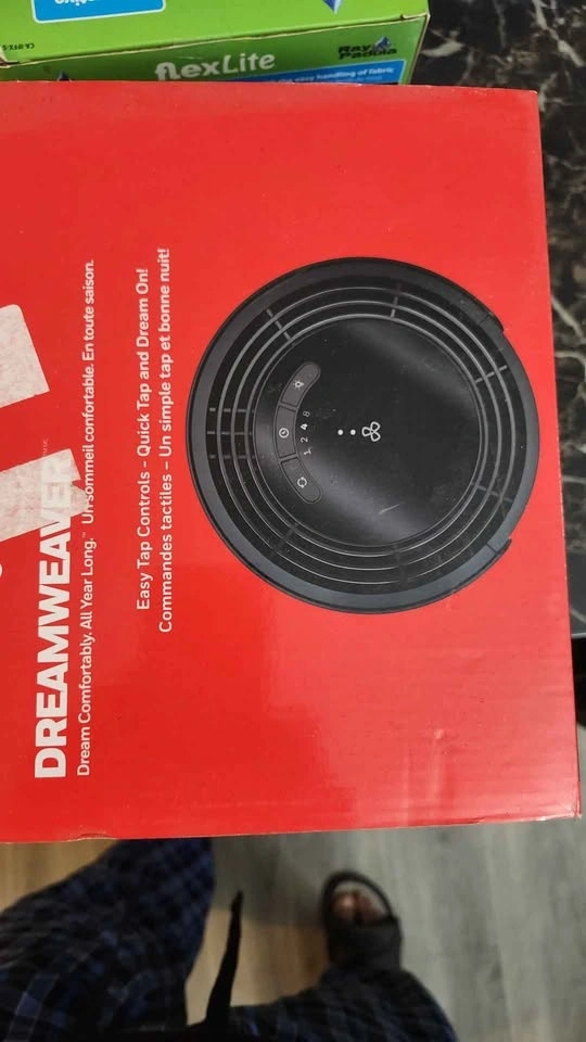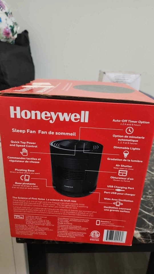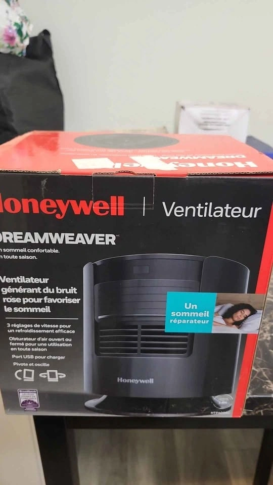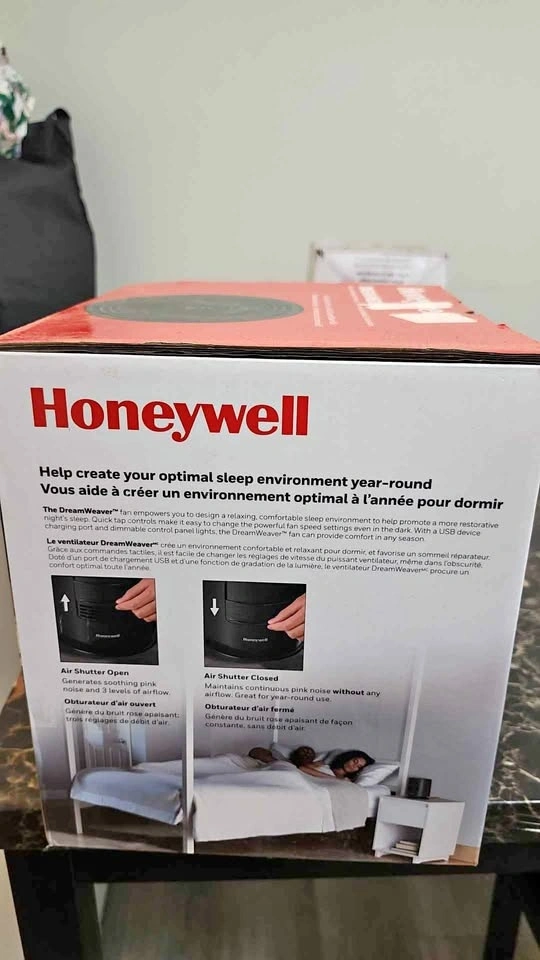 Versatile Honeywell DreamWeaver sleep fan. Has auto-off timer with 1, 2, 4, and 8 hour options. Dimmable lights. Air shutter for pink noise or airflow. USB charging port. Wide area oscillation. Quick tap power and speed control. Pivoting base. Helps create a relaxing sleep environment.