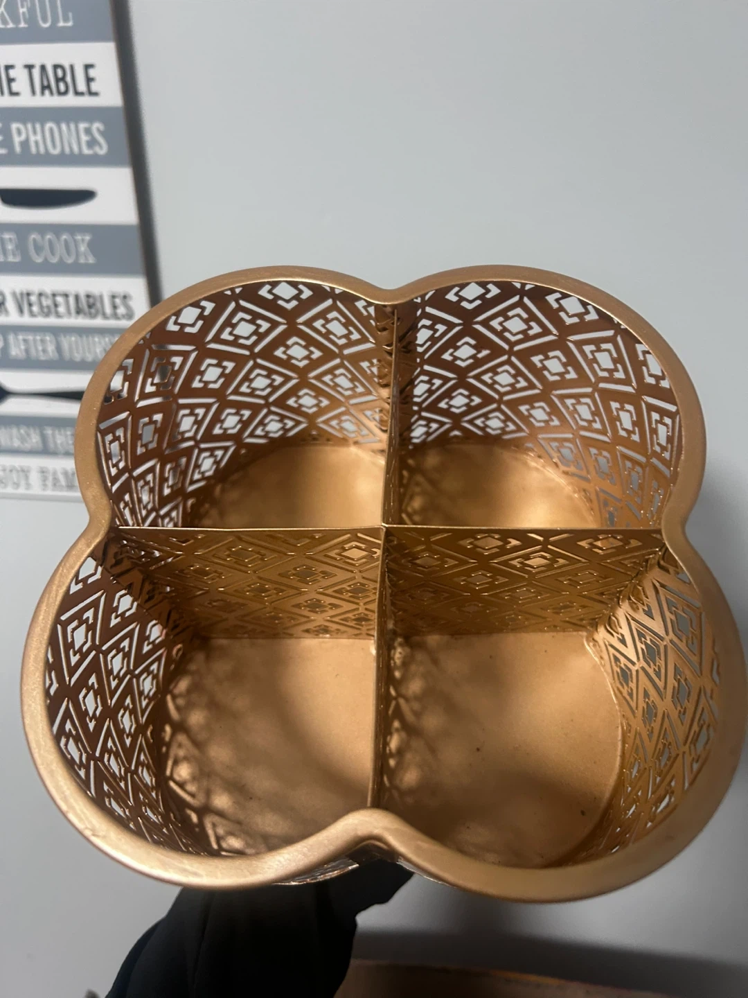 This decorative metal basket has four compartments. It's great for organizing small items like mail, keys, or craft supplies. The gold finish with intricate cut-out patterns adds a touch of elegance to any space.