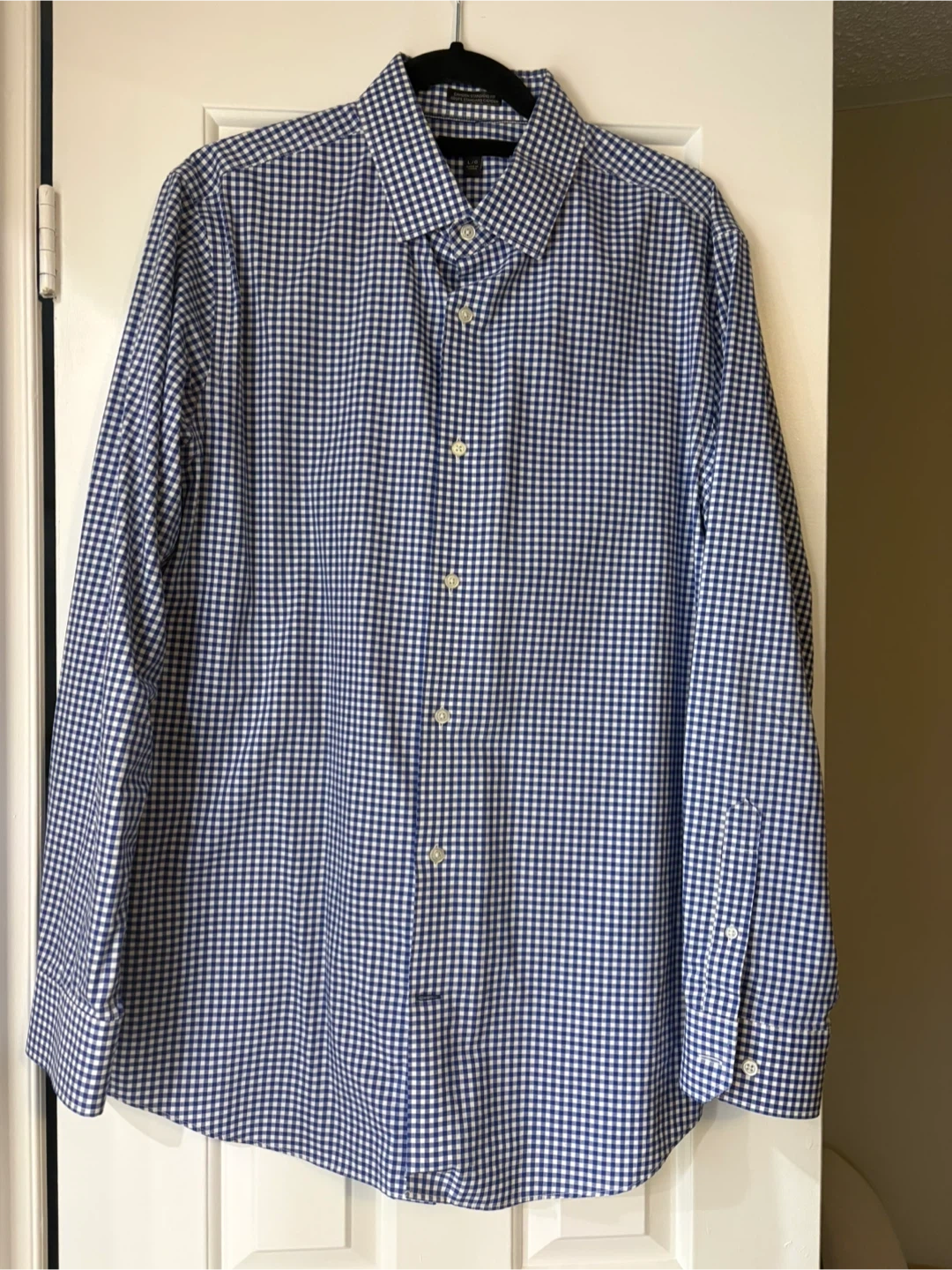 Blue and white gingham long sleeve button-up shirt. This classic fit shirt is made from a comfortable cotton blend. It's suitable for casual or business casual wear. Size large