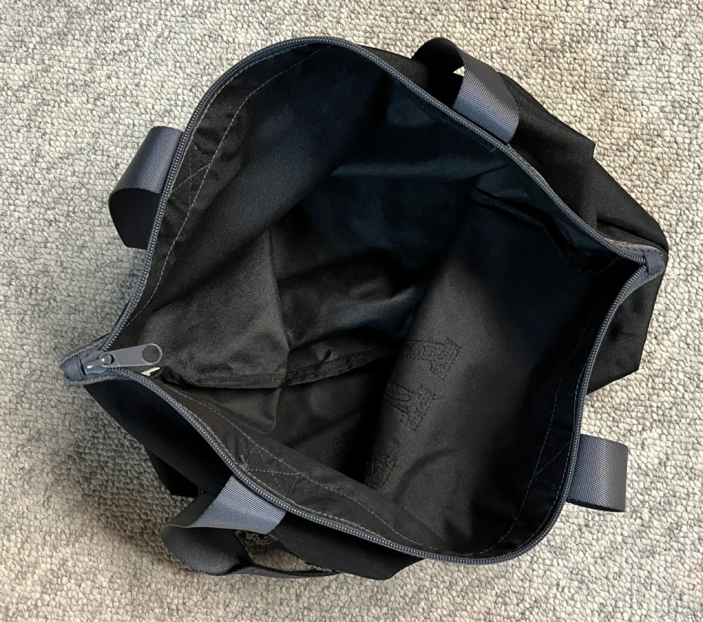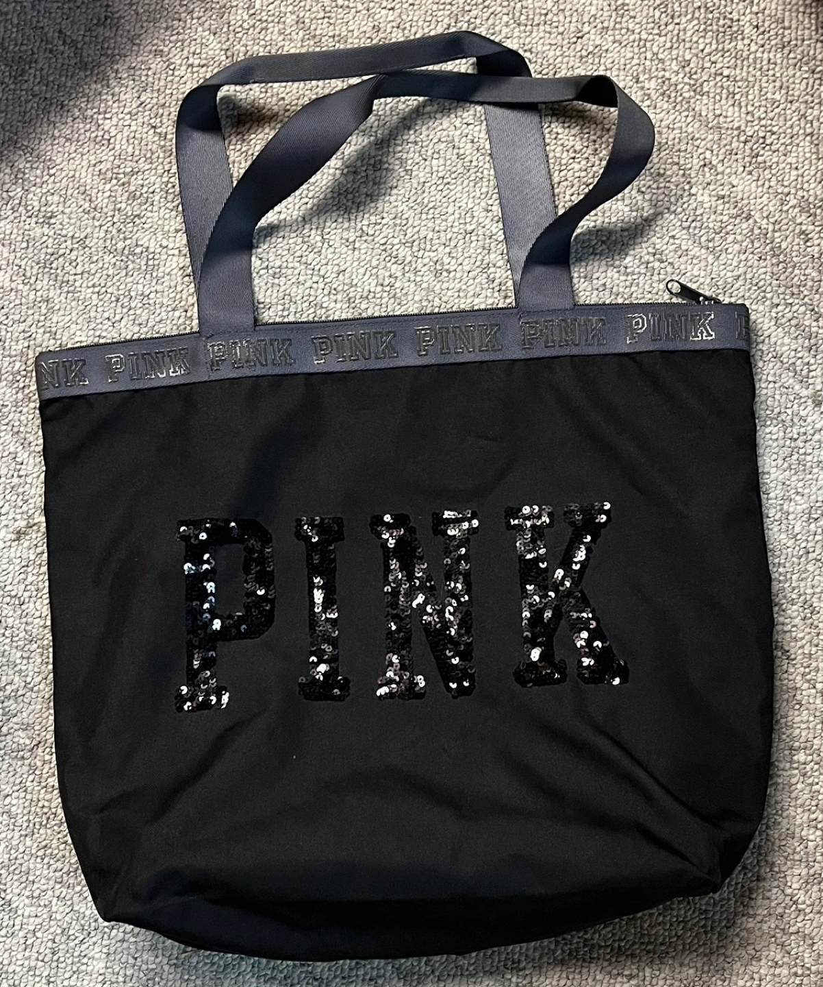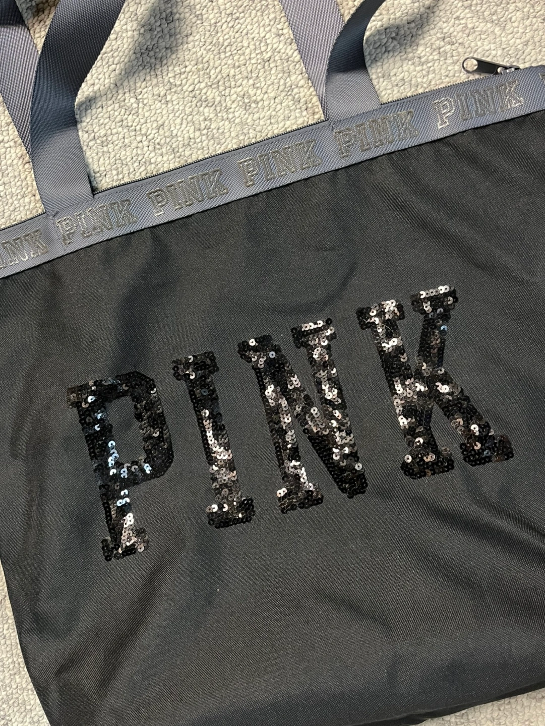 Black tote bag. Features grey straps and a zipper closure. Sequined PINK logo on the front. PINK branding on the top trim.