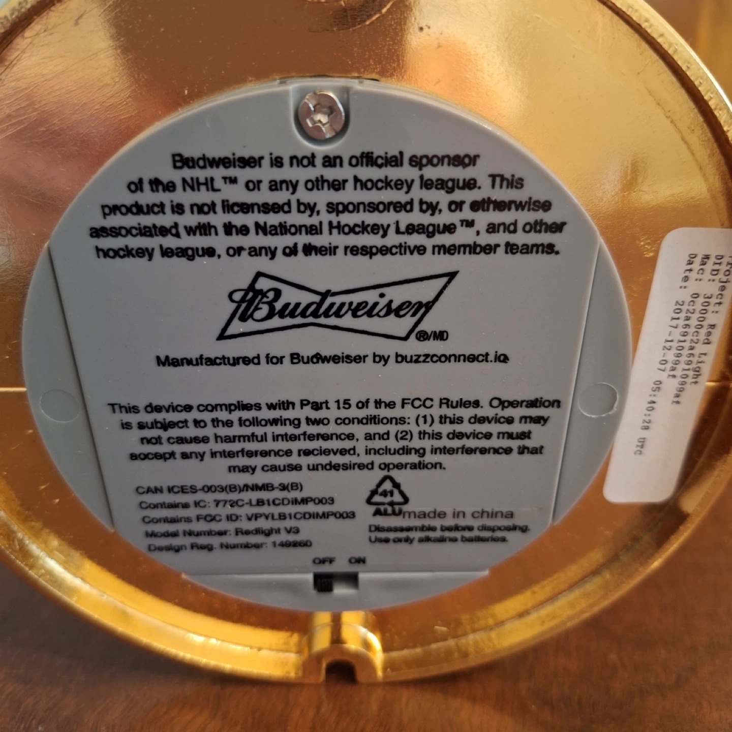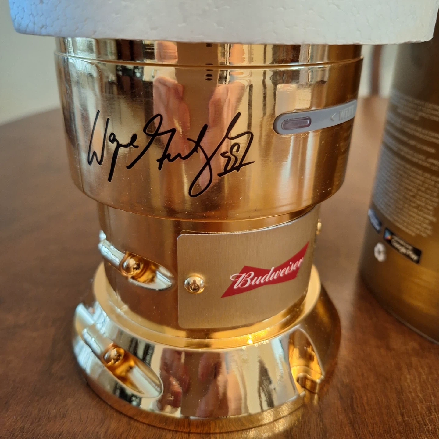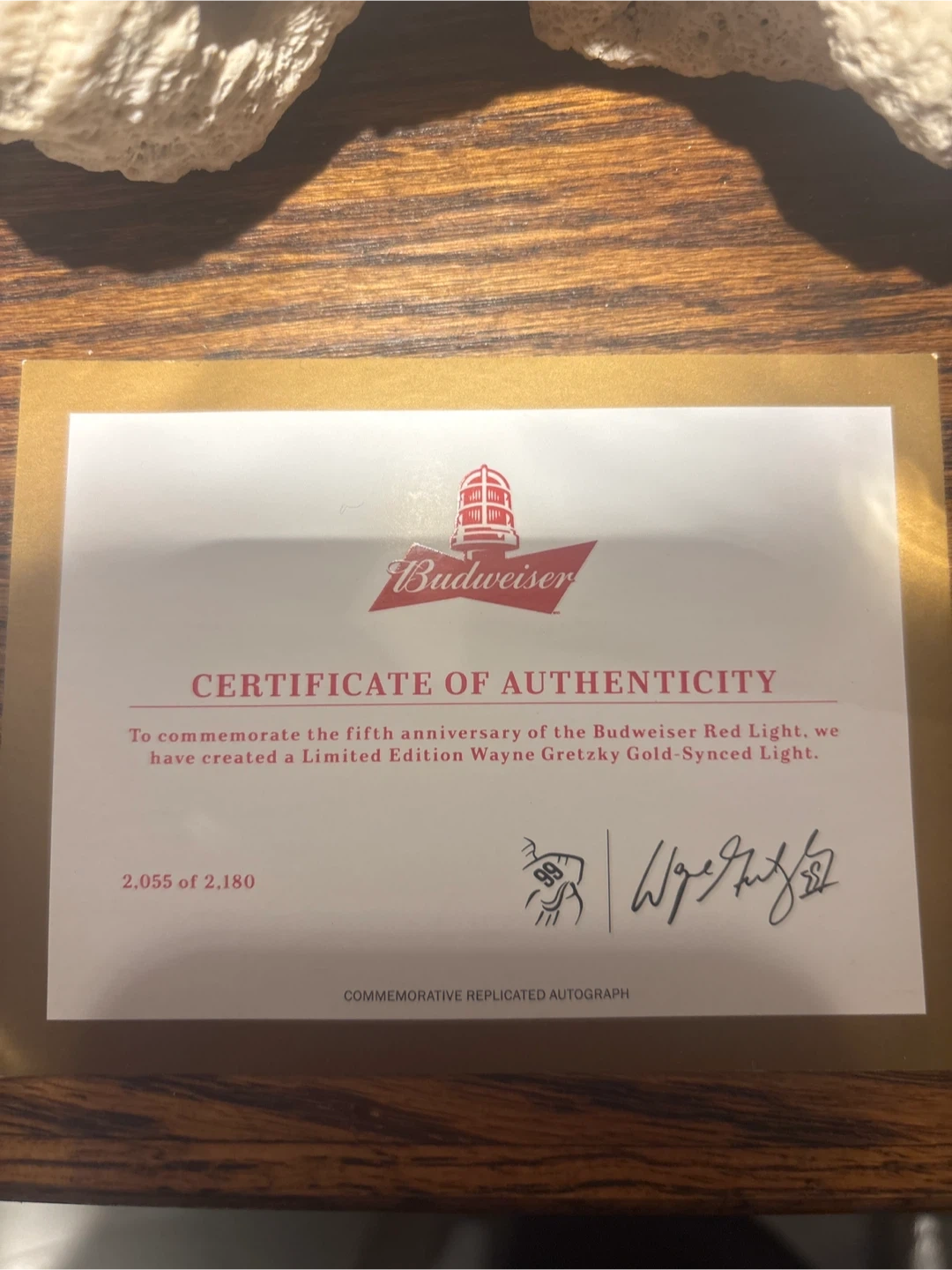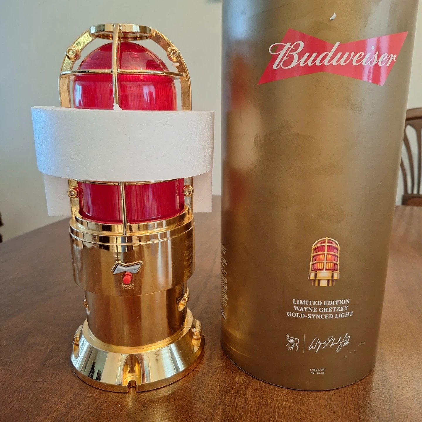Budweiser Limited Edition Wayne Gretzky Gold-Synced Light. It's a red light with gold accents. Comes with original packaging. Can be synced to your phone to light up when your team scores. Never used in original packaging. Certification of authenticity included. Limited edition 2055 of 2180
