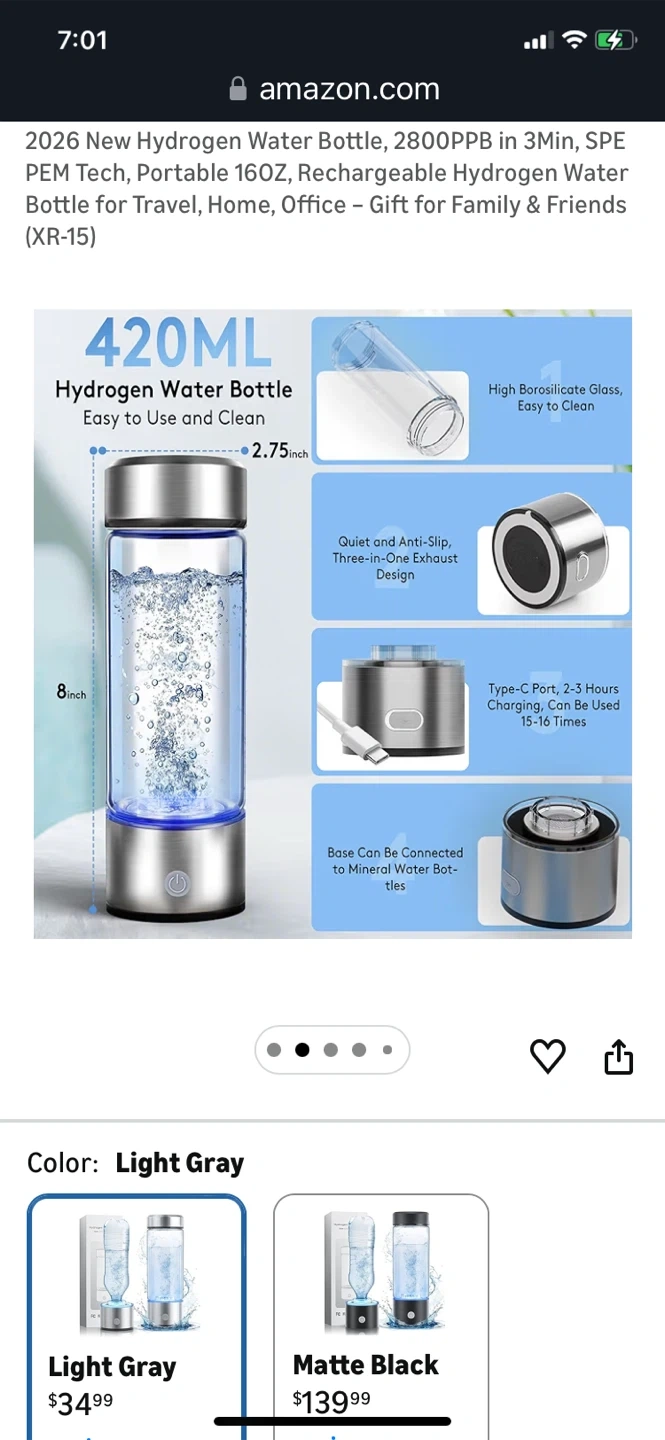 This portable hydrogen water bottle utilizes SPE/PEM technology to quickly improve water. It has a 420ml capacity and is 8 inches tall. Type-C charging provides 15-16 uses per 2-3 hour charge.