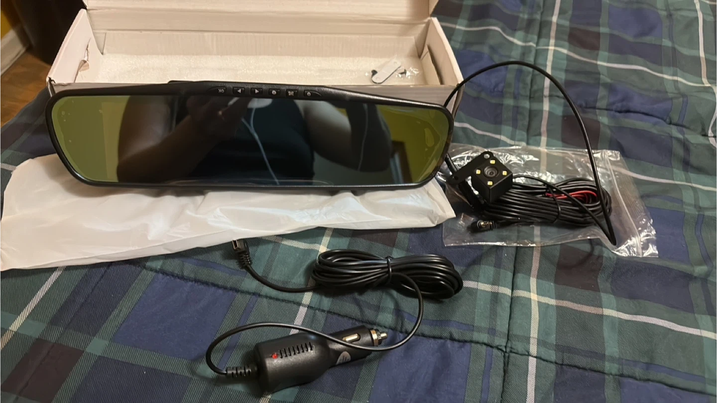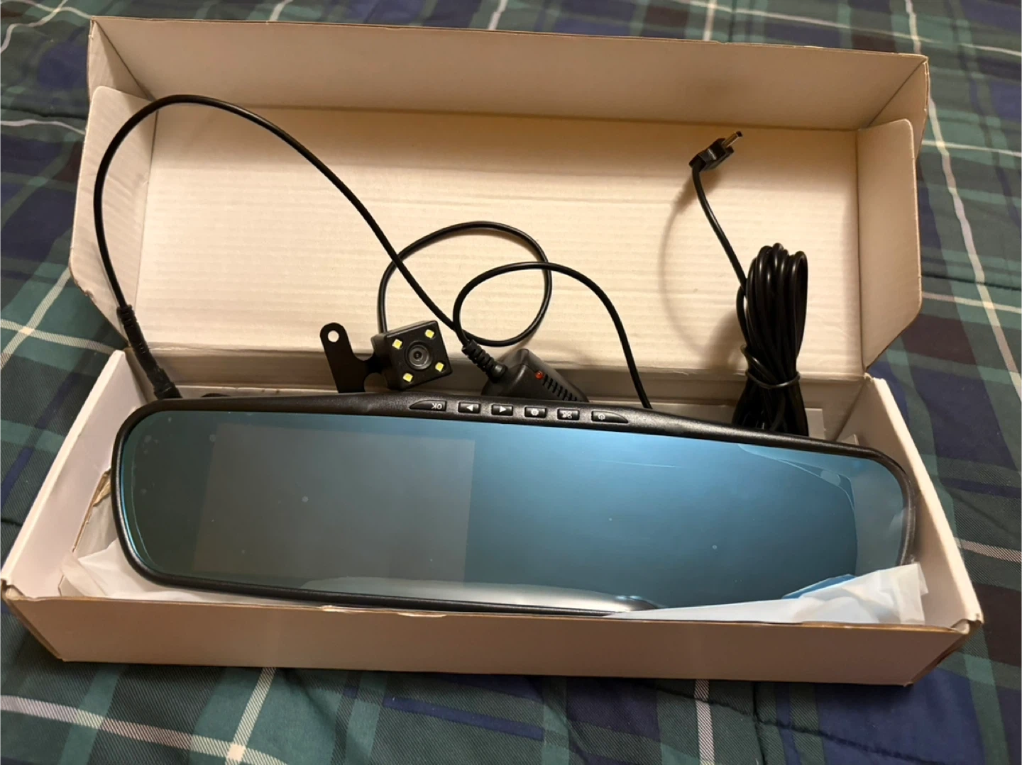 This is a rearview mirror dash cam with a backup camera. It's in a box and includes all necessary cables. The mirror has a blue tint and buttons along the top edge.