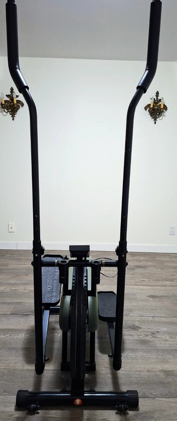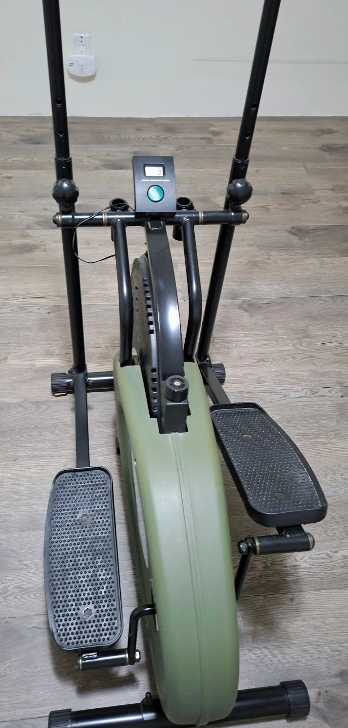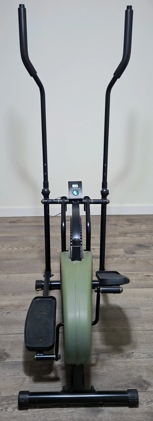 This is an elliptical exercise machine with a digital display. It's black and olive green. It's a good way to get a cardio workout at home! It's designed simple, compact and can be moved around easily with small built-in wheels.