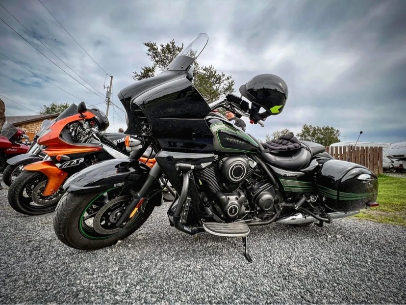 This is a black Kawasaki Vulcan cruiser motorcycle with 12k on it. It has saddlebags for storage and a windscreen. Lots of aftermarket accessories. One owner.No test pilot and serious inquiry only.thanks for viewing