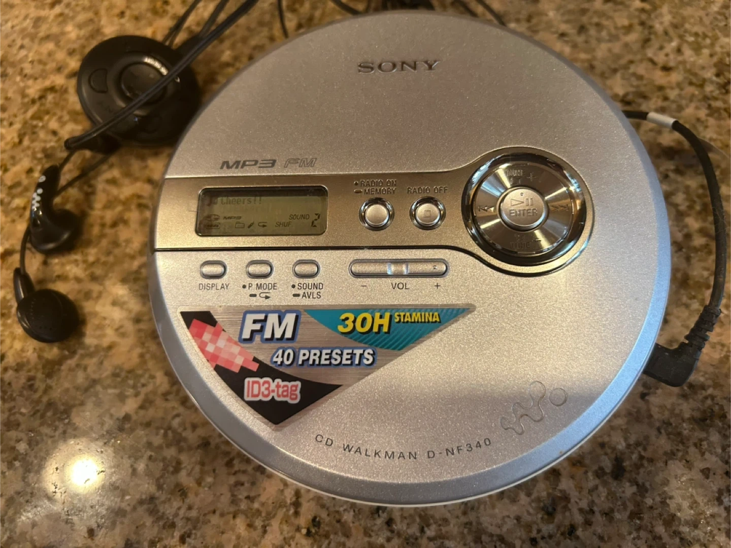 This is a silver Sony CD Walkman MP3 player, model D-NF340. It supports MP3 playback and has FM radio with 40 presets and ID3 tag support. It offers 30 hours of stamina.