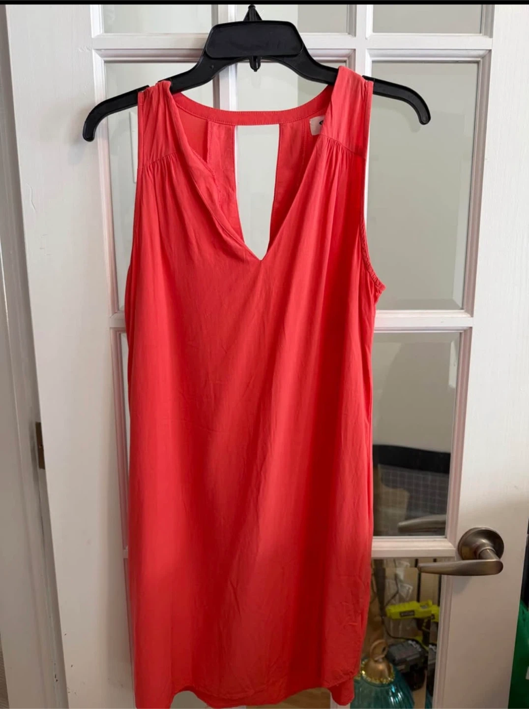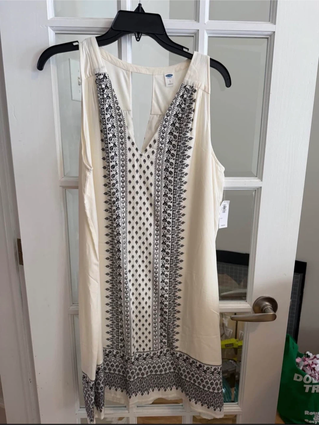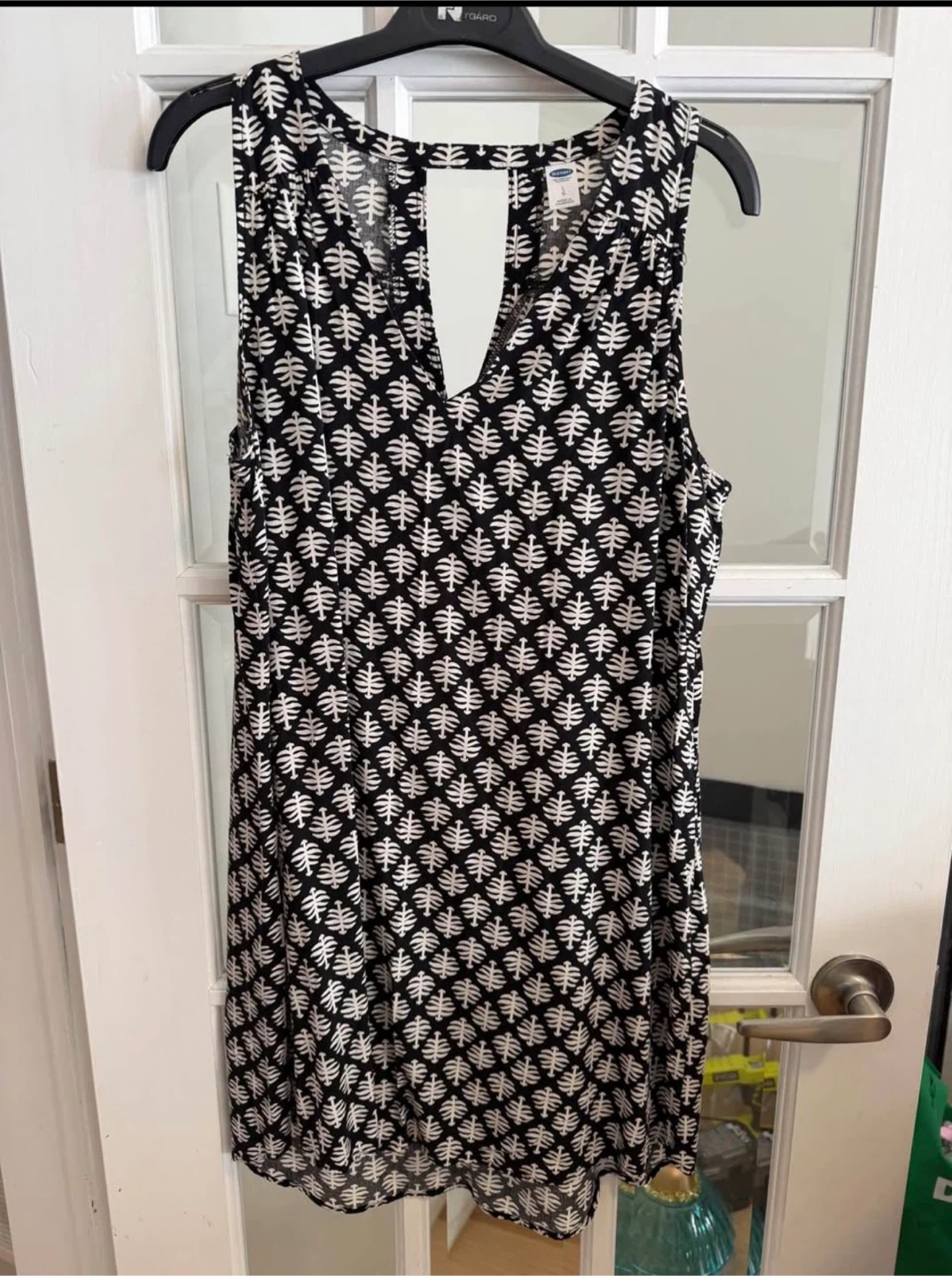 This is a sleeveless V-neck dress from Old Navy. It features a keyhole cutout at the back and a flowy silhouette. Available in multiple prints and colours.