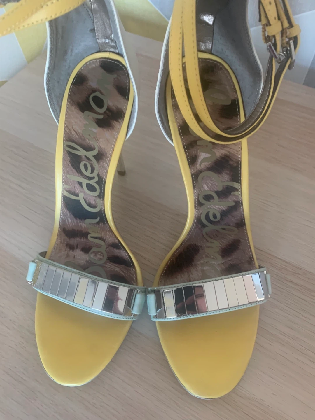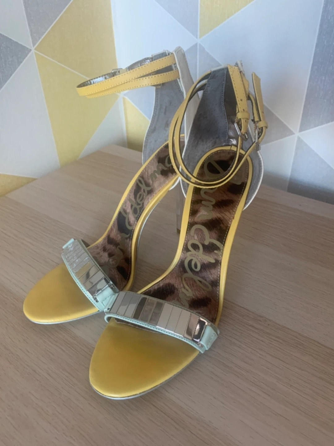 These stylish Sam Edelman heels feature a vibrant yellow hue complemented by silver and white detailing. They have a buckle ankle strap and a zipper closure at the back. Heel is clear and approx 4 inches. Size 8-8,5. Never worn. Make an offer.