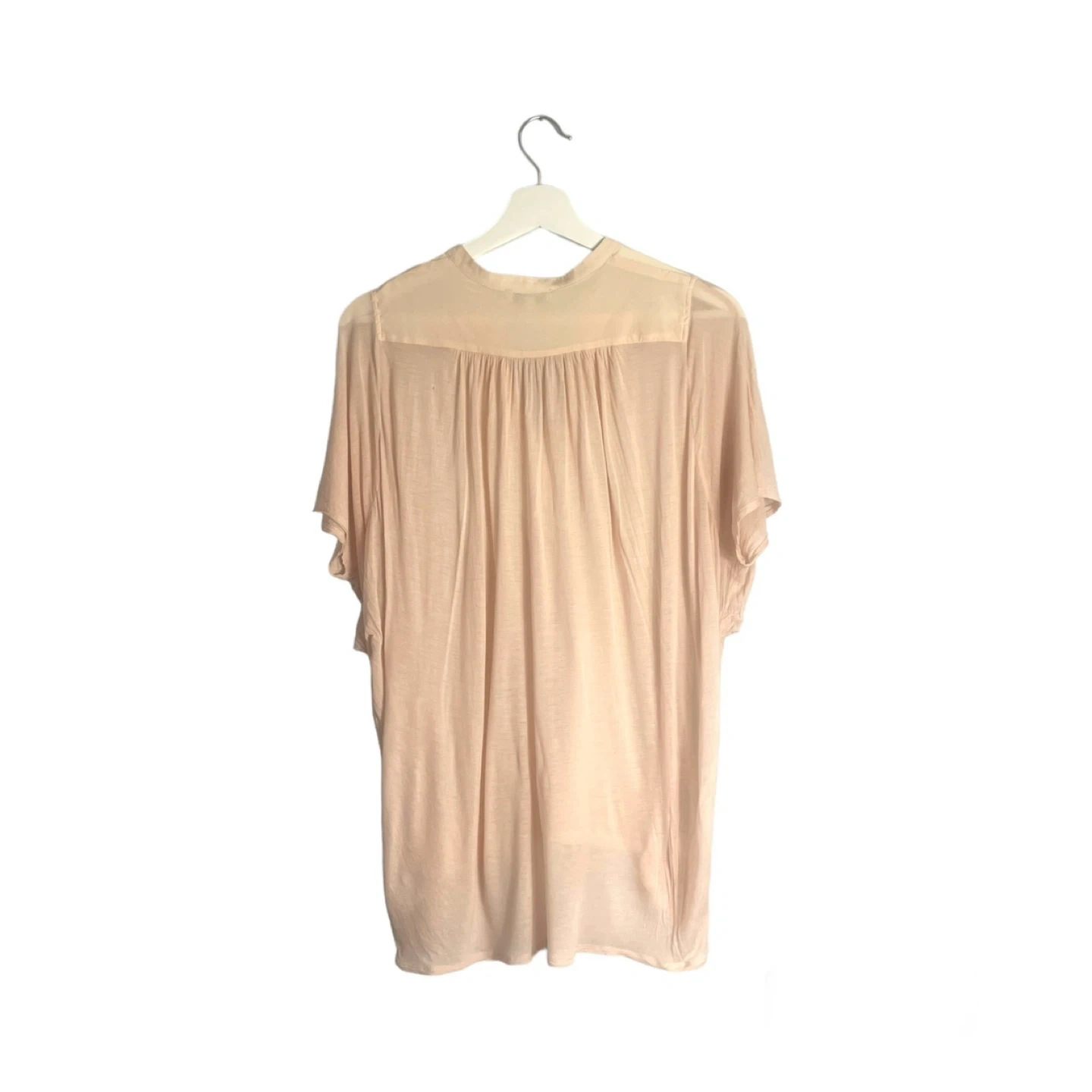 Elevate your wardrobe with this elegant blush pink, sheer V-neck tunic top. Designed with a lightweight, breathable fabric, this flowy blouse offers both comfort and style. The draped, loose fit makes it perfect for layering or wearing on its own, while the delicate pleating detail at the front and back adds a touch of sophistication.