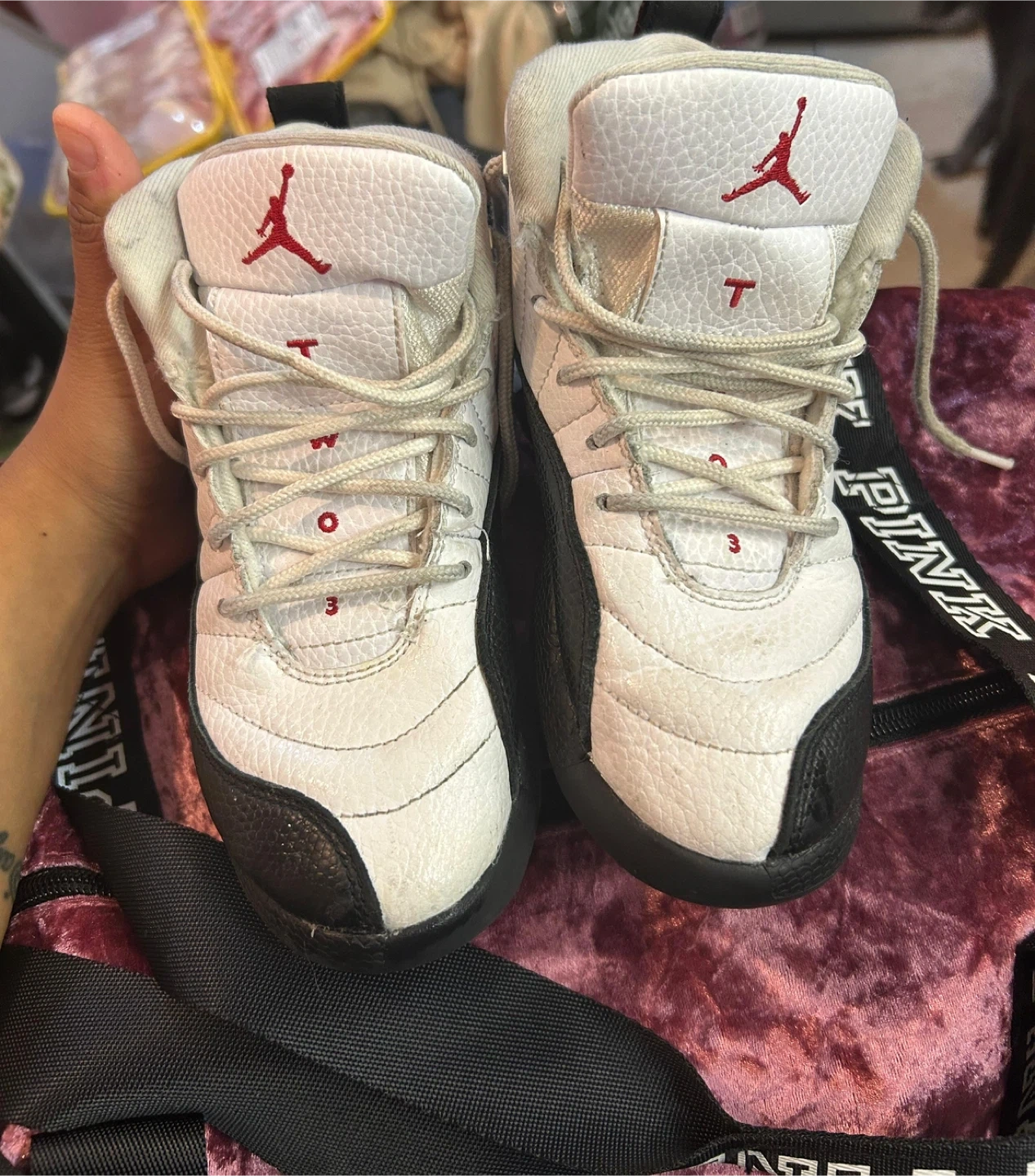 Toddler Air Jordan 12 Retro TD "Taxi" shoes. White tumbled leather with black accents and red Jumpman logo. Lace-up closure for a secure fit. These toddler sneakers are great for little ones starting out!