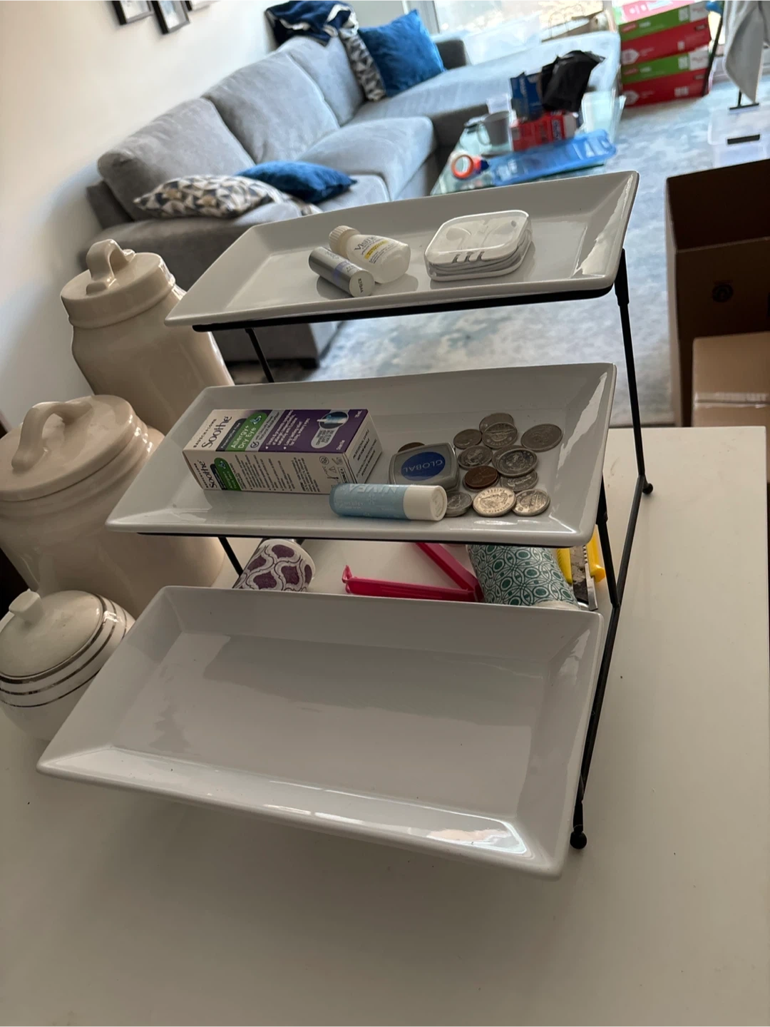 This is a white 3-tier serving tray with a black metal stand. It's perfect for displaying snacks, desserts, or small items. The trays are rectangular and have a clean, modern look. The trays are ceramic.