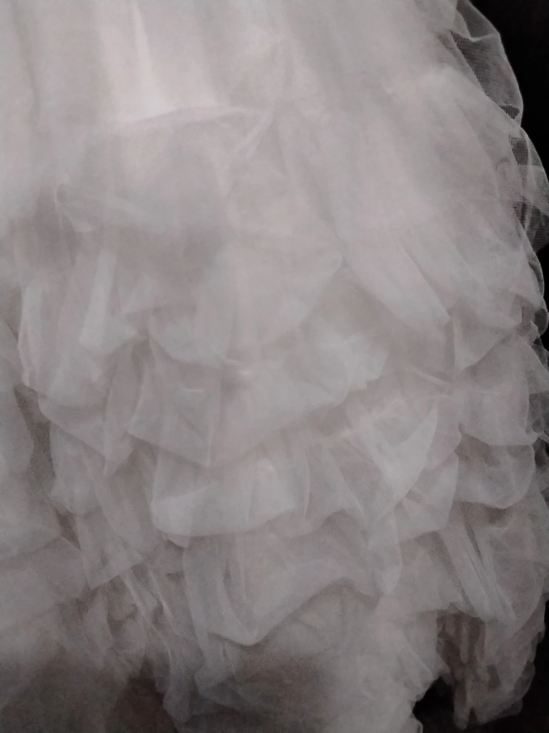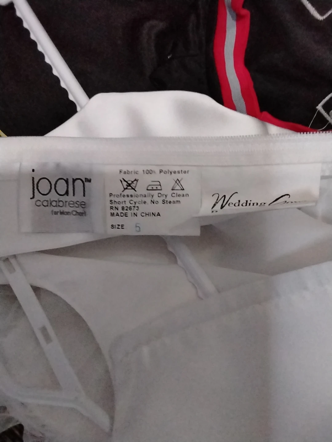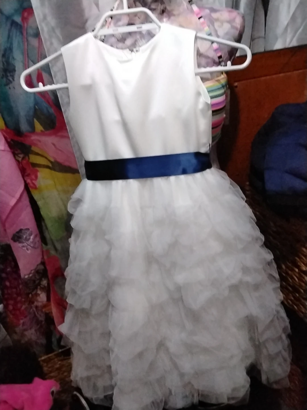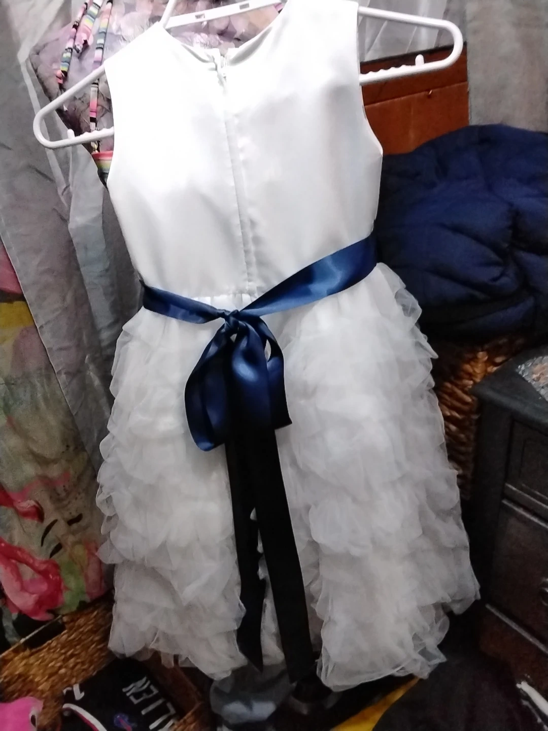 White sleeveless dress by Joan Calabrese. It has a satin bodice with a navy blue satin sash and a ruffled tulle skirt. Size 5. Made in China.