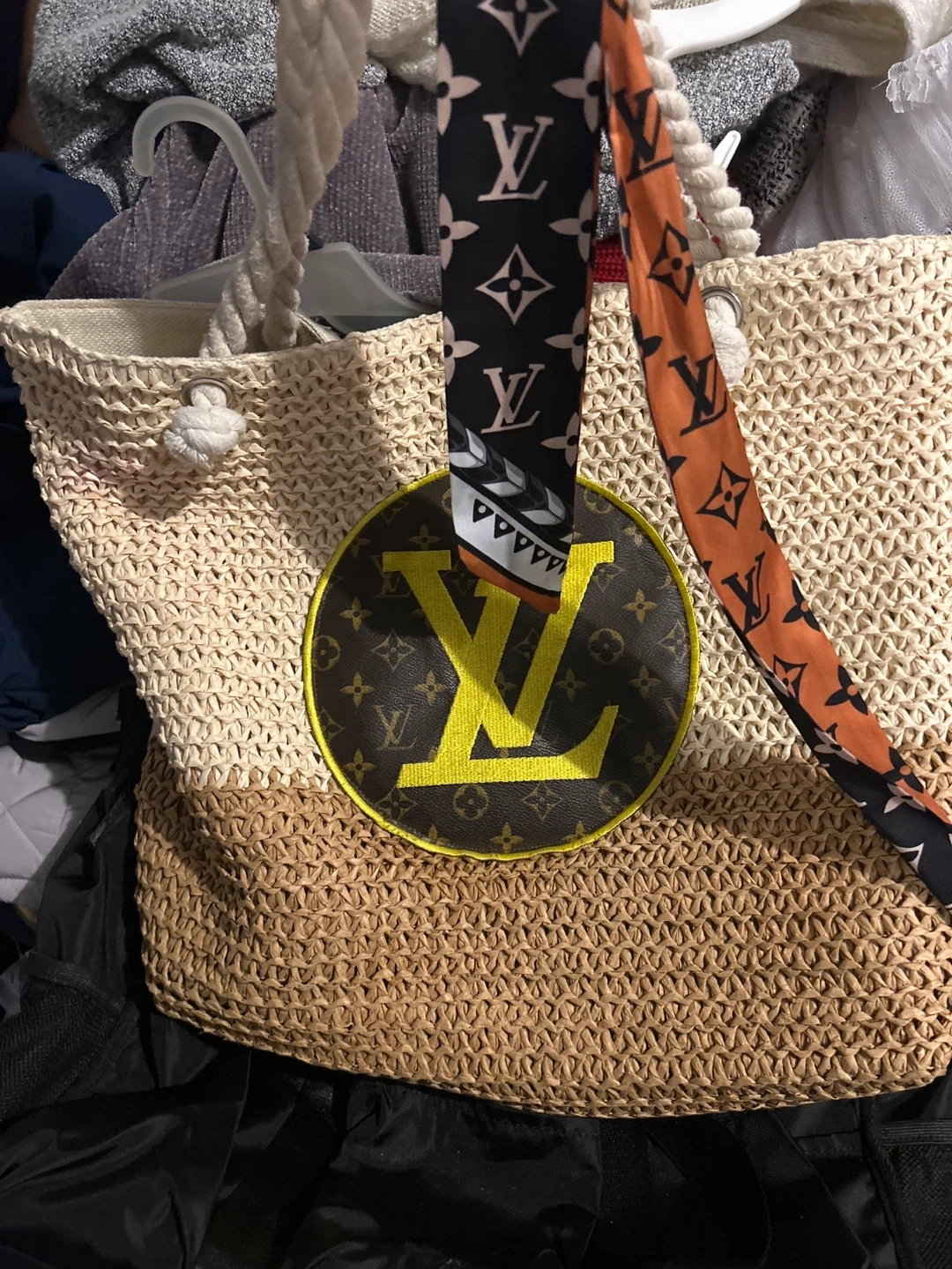 Woven straw tote bag with a removable decorative scarf. Features a large LV-inspired applique. Interior is lined with a zippered pocket.