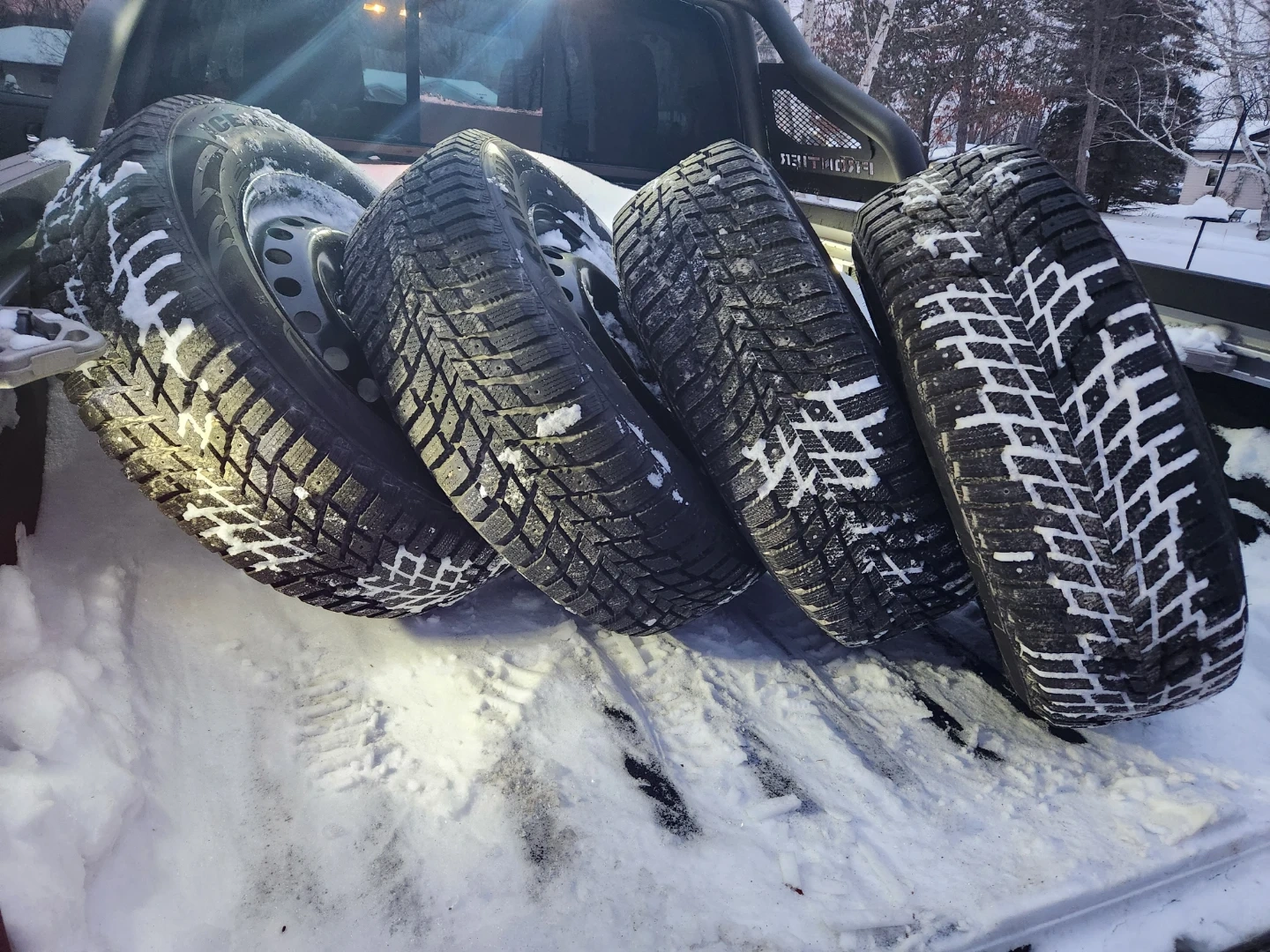 Four Sailun winter tires, size 215/65R16, mounted on black rims. These tires are designed for winter driving conditions. Brand new as only used for 7 days and ready for the snow!